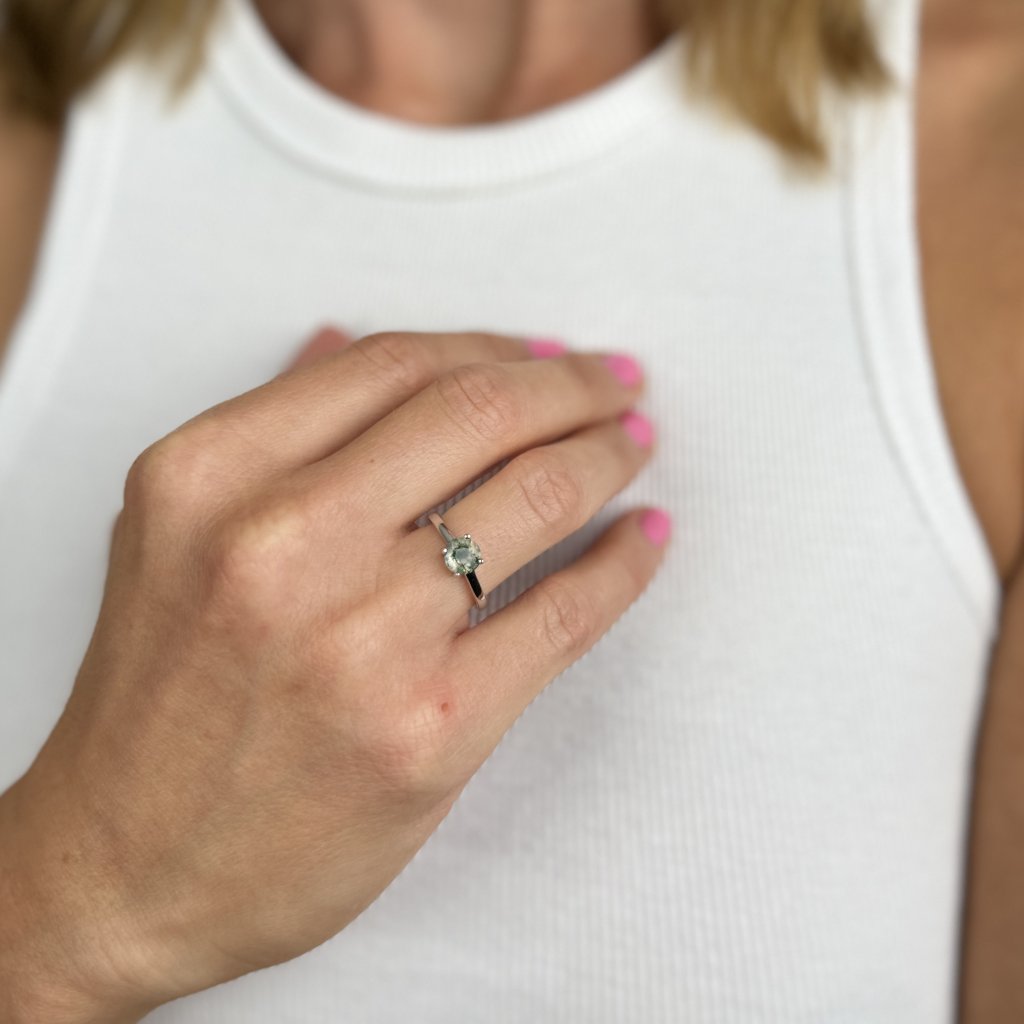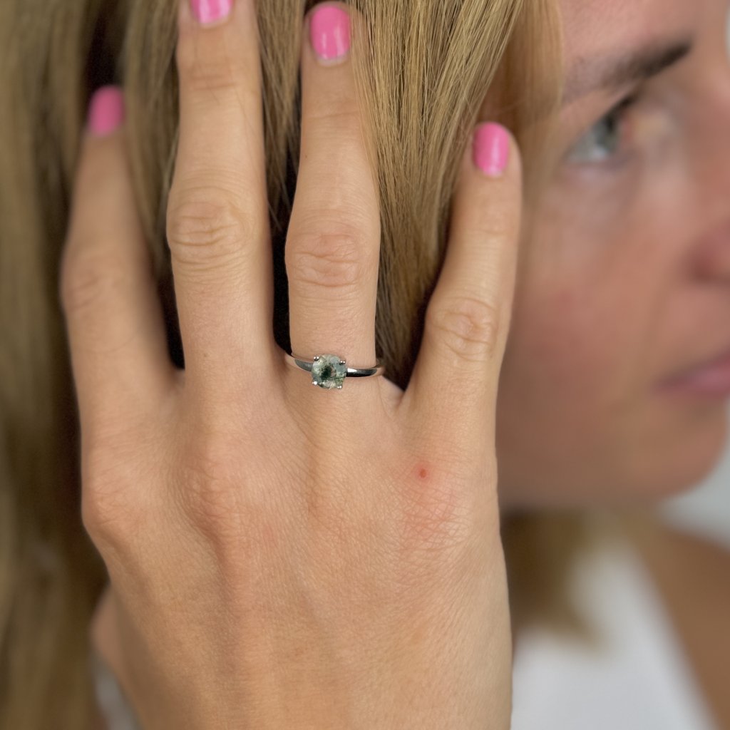 Srebrny pierścionek CORINNE jest uosobieniem naturalnego piękna i elegancji. Wykonany z wysokiej jakości srebra próby 925 z rodowanym wykończeniem, które zapewnia długotrwały połysk i ochronę przed matowieniem. Sercem pierścionka jest piękny agat mszysty o średnicy 6 mm, który przyciąga uwagę swoją wyjątkową strukturą i kolorem.