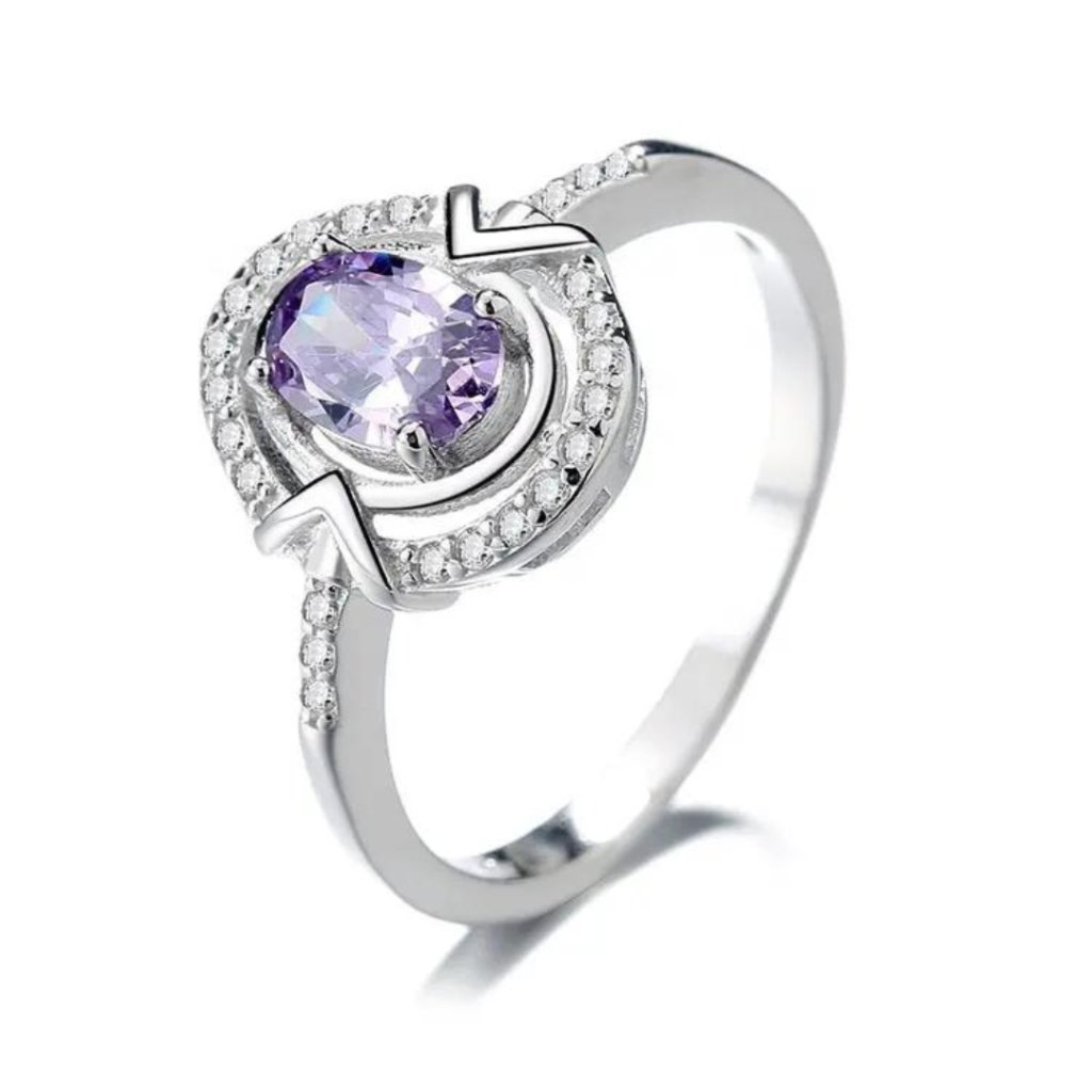 Srebrny pierścionek VIOLETTE jest uosobieniem elegancji i wyrafinowania. Ta oszałamiająca biżuteria ma uderzający design, zdominowany przez piękną fioletową cyrkonię sześcienną o wymiarach 4 × 6 mm. Mniejsze przezroczyste cyrkonie sześcienne są rozrzucone wokół centralnego kamienia, nadając pierścionkowi dodatkowy blask i połysk.