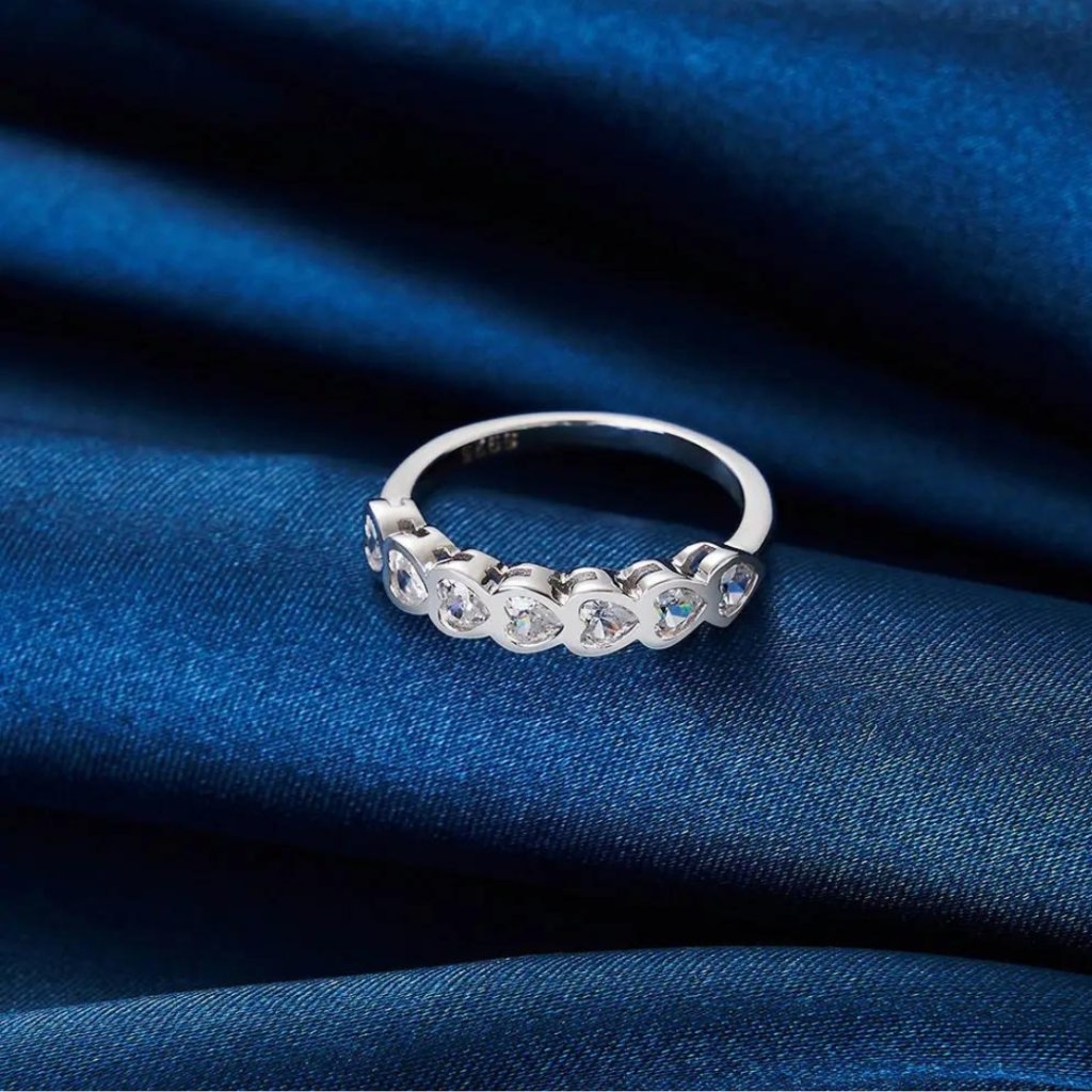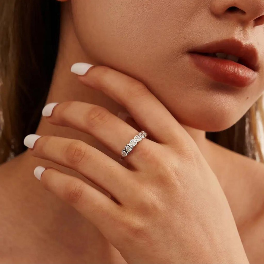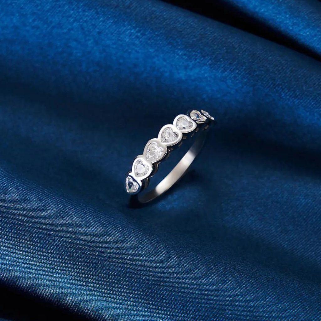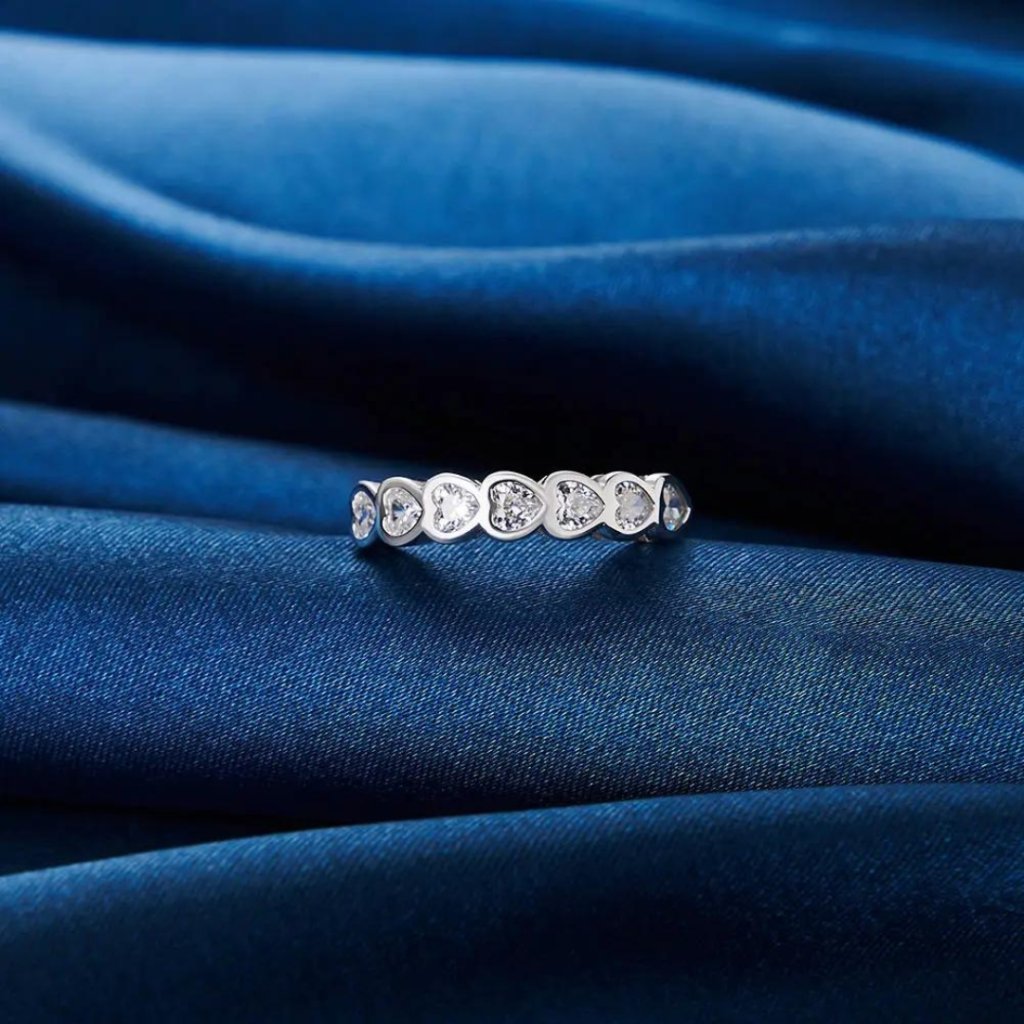 Głównym motywem pierścionka jest seria maleńkich serduszek, z których każde ozdobione jest błyszczącą cyrkonią sześcienną w kształcie serca. To połączenie tworzy imponujący efekt, który symbolizuje głębię i siłę miłości.