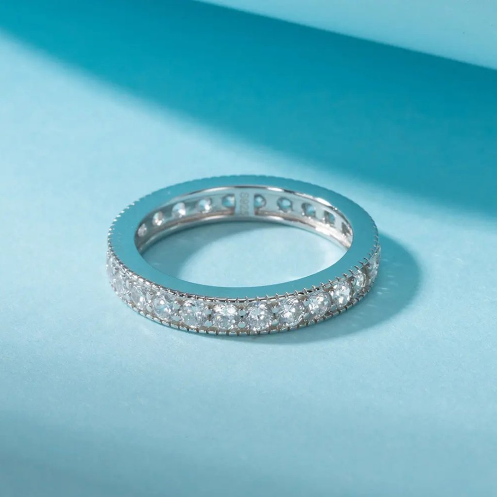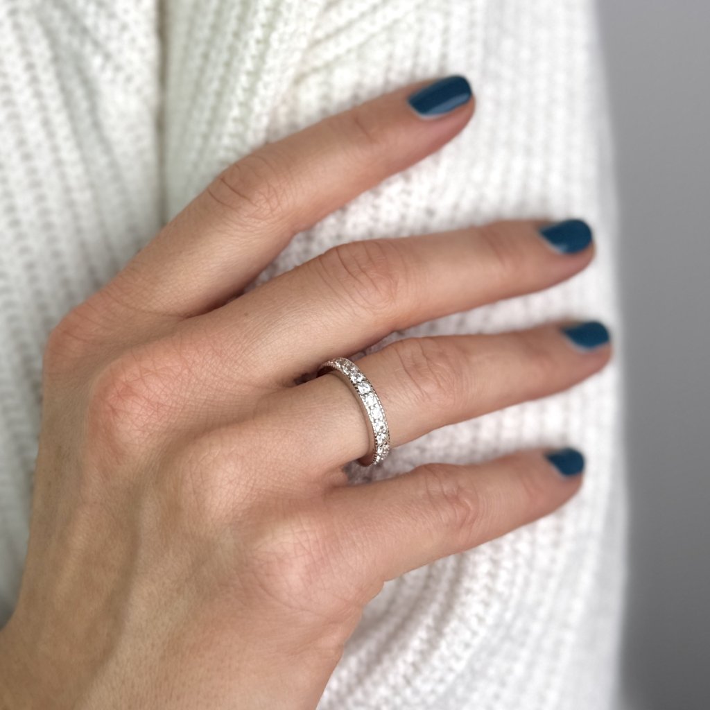 Szerokość pierścionka wynosząca 3 mm zapewnia wygodne dopasowanie, zapewniając jednocześnie dużo miejsca na wyróżnienie się wszystkich cyrkonii sześciennych. Rodowane wykończenie chroni klejnot przed utratą blasku i zapewnia długotrwałe piękno.