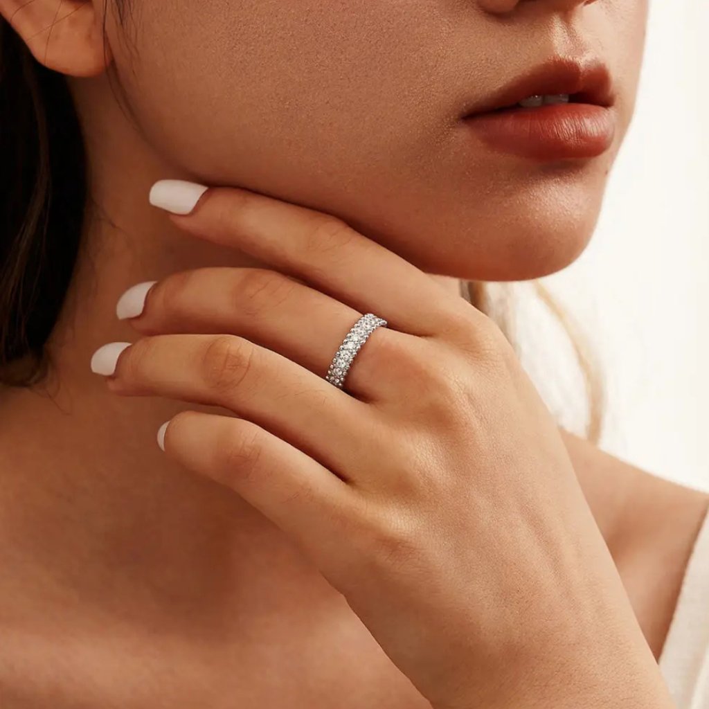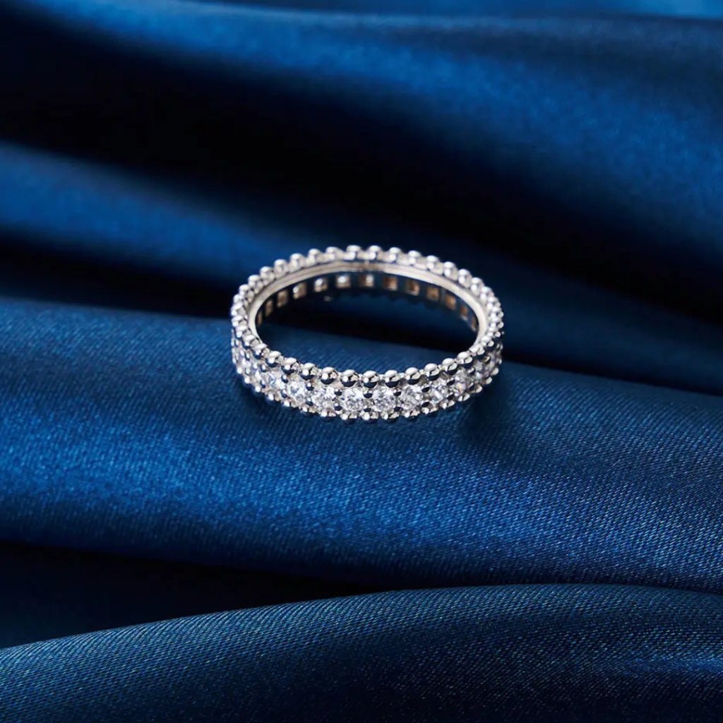 Pierścionek wysadzany jest mieniącymi się cyrkoniami sześciennymi o średnicy 2 mm, które tworzą imponującą kompozycję. Każdy kamień jest precyzyjnie osadzony w wysokiej jakości srebrze próby 925/1000, co gwarantuje doskonały blask pod każdym kątem.