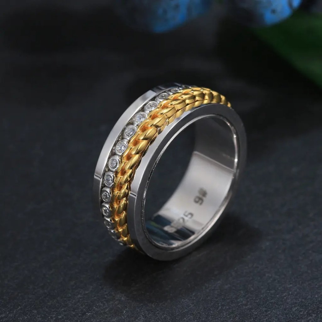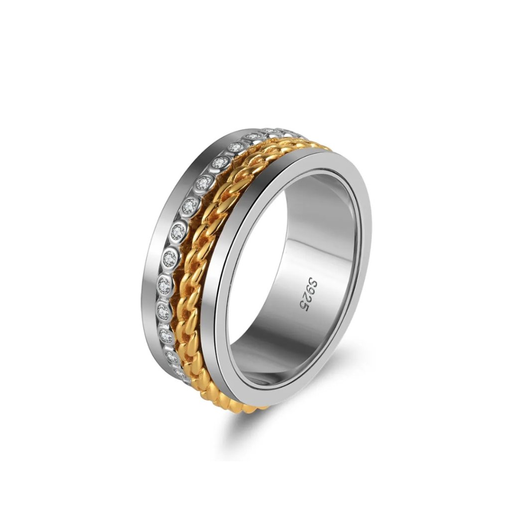 Przedstawiamy innowacyjny pierścionek ARON ze srebra próby 925/1000, który łączy elegancki design z praktyczną funkcją antystresową. Jego głównym elementem są dwa obrotowe paski - jeden ozdobiony błyszczącymi cyrkoniami, a drugi z pozłacanym wzorem łańcuszka.