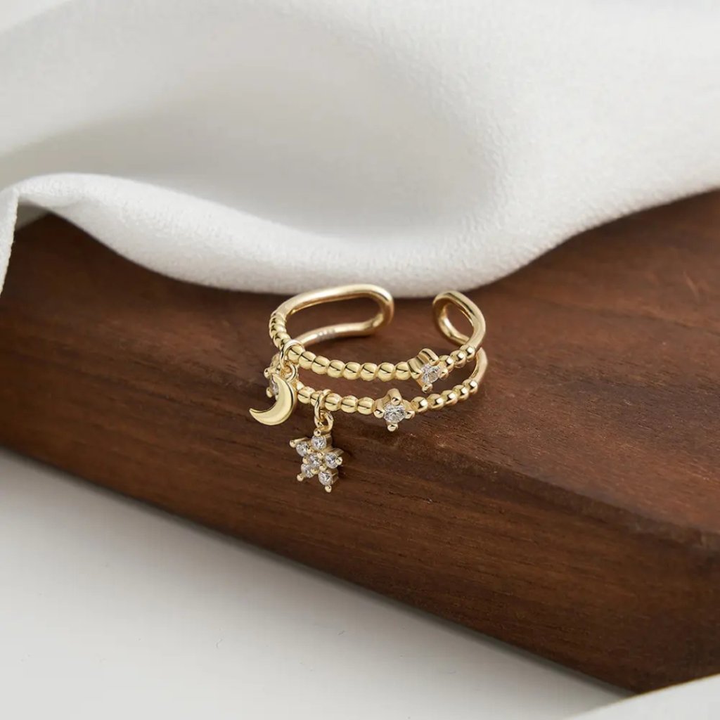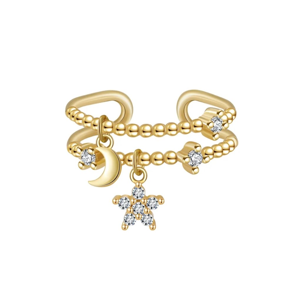 Odkryj piękno regulowanego pierścionka SERAFINA, który łączy w sobie elegancję z romantycznym designem. Ten uroczy klejnot zdobią zawieszki z motywem gwiazdy i księżyca, które są wysadzane drobnymi cyrkoniami. Pozłacanie 14-karatowym złotem nadaje pierścionkowi luksusowy wygląd i zapewnia długą żywotność.