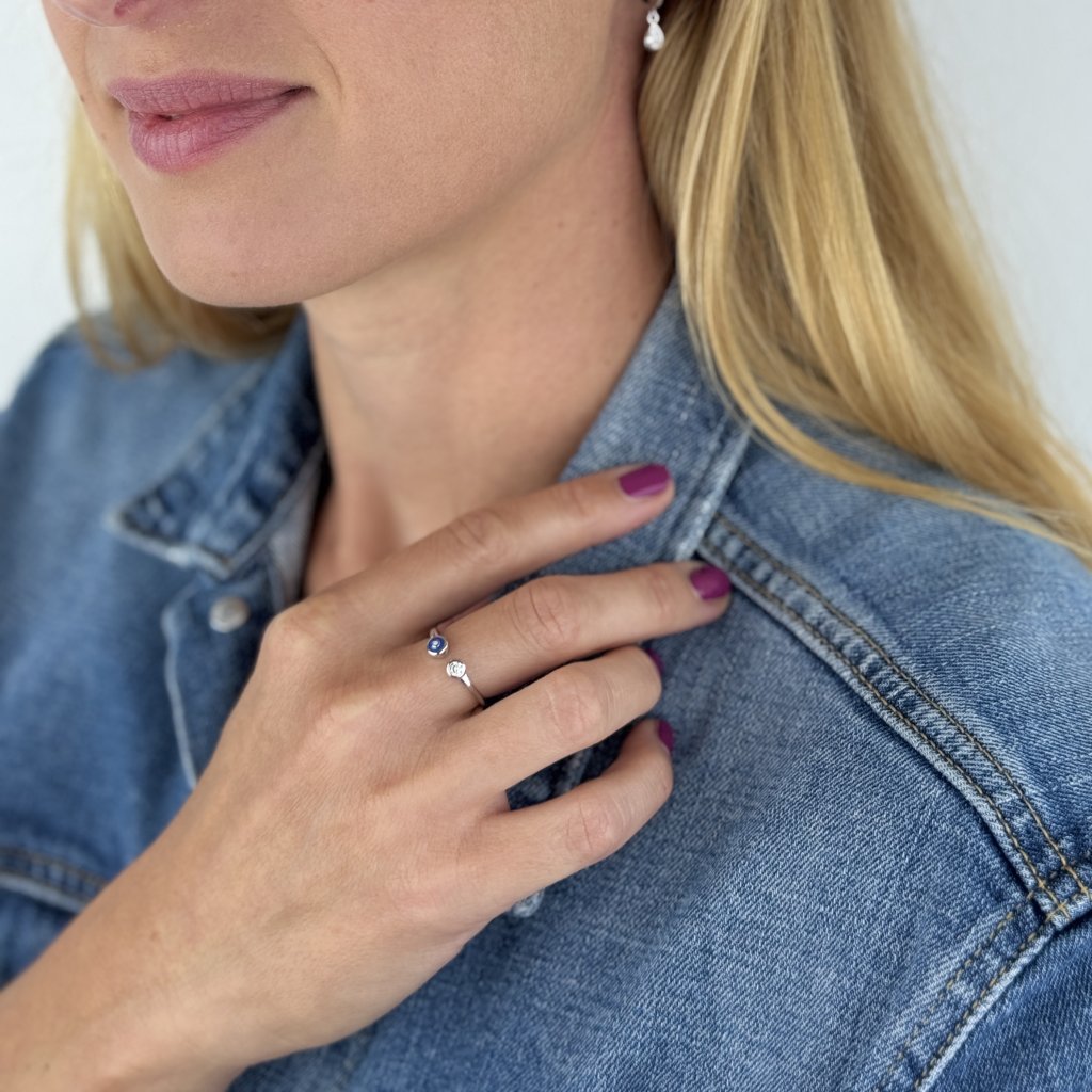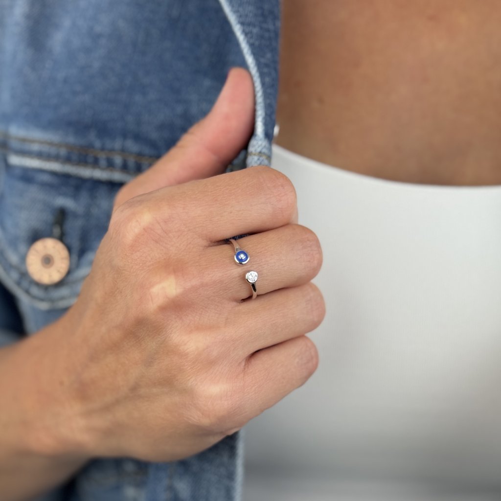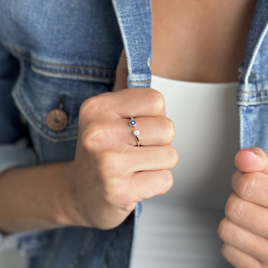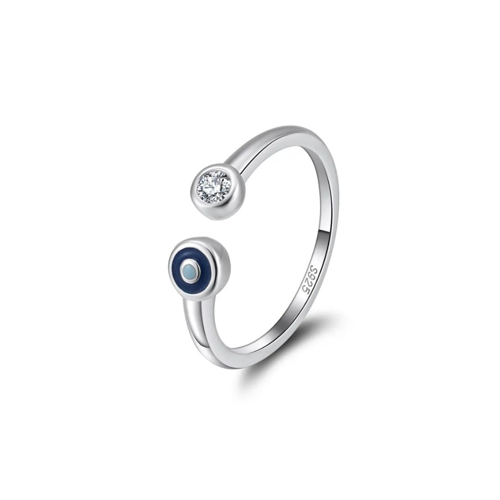 Odkryj urok srebrnego pierścionka SELINE, który łączy w sobie nowoczesny design z pradawną symboliką ochronną. Jeden koniec zdobią błyszczące, czyste cyrkonie, a drugiemu przewodzi symbol niebieskiego oka, które od wieków służy jako amulet ochronny przed negatywną energią i zawistnymi spojrzeniami.