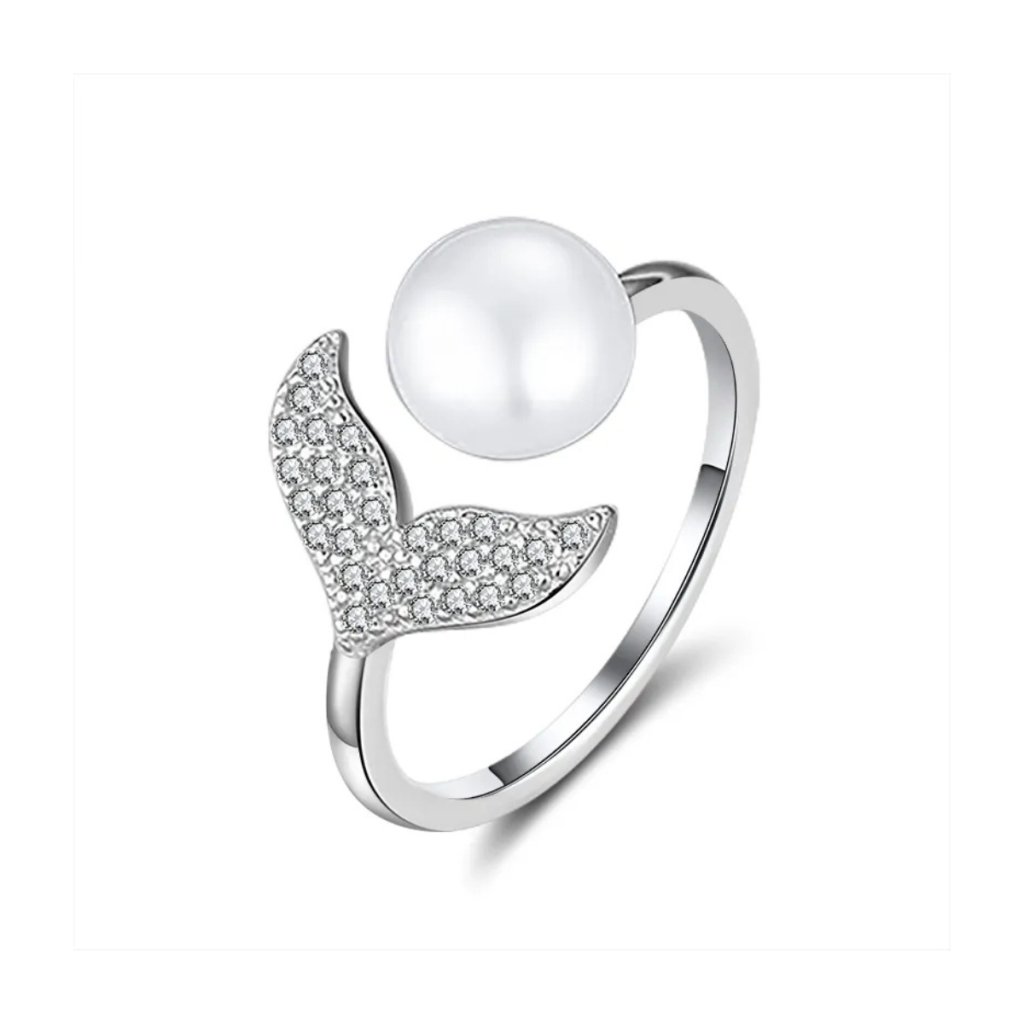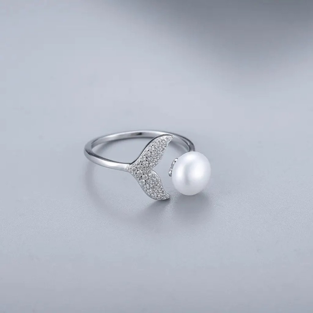 Odkryj urok srebrnego pierścionka STELA, który łączy elegancję perły z figlarnością motywu morskiego. Ta efektowna biżuteria z rodowanego srebra próby 925/1000 wyróżnia się otwartą konstrukcją, w której z jednej strony spotyka się piękna perła o średnicy 8 mm z błyszczącą płetwą wysadzaną cyrkoniami z drugiej strony.