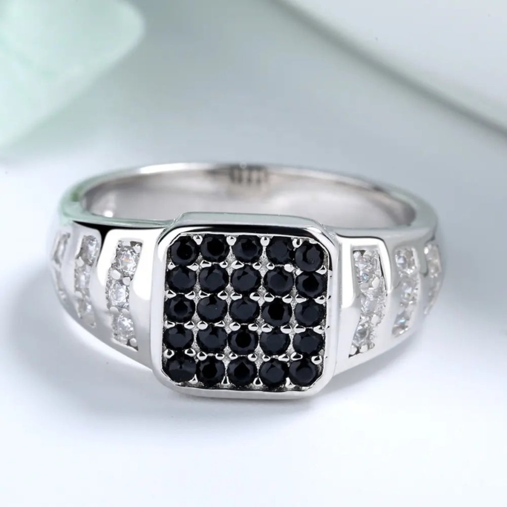 Dominującym elementem pierścienia jest efektowna szachownica utworzona z czarnych cyrkonii, która tworzy interesujący kontrast z przezroczystymi cyrkoniami po bokach. Precyzyjne wykonanie i przemyślany design sprawiają, że pierścień ten jest doskonałym dodatkiem na każdą okazję, zarówno na co dzień, jak i na uroczyste wydarzenia.