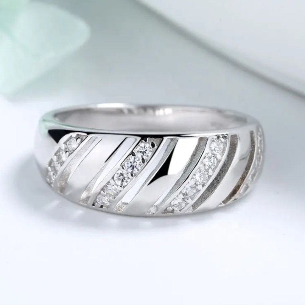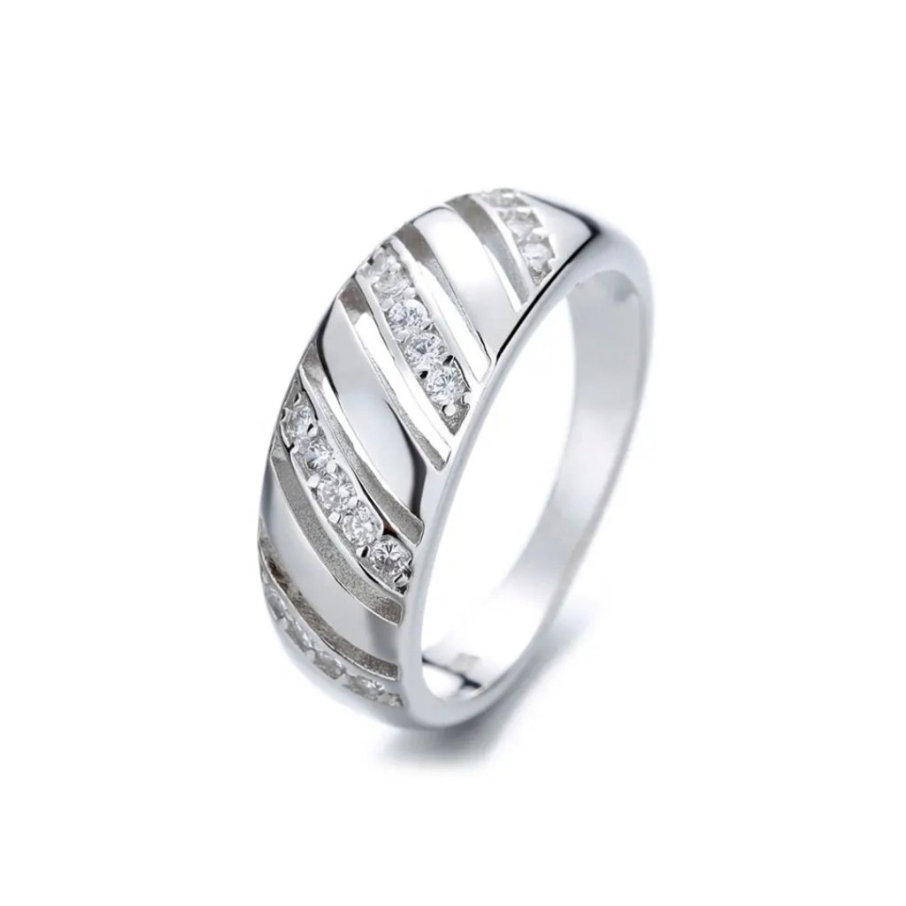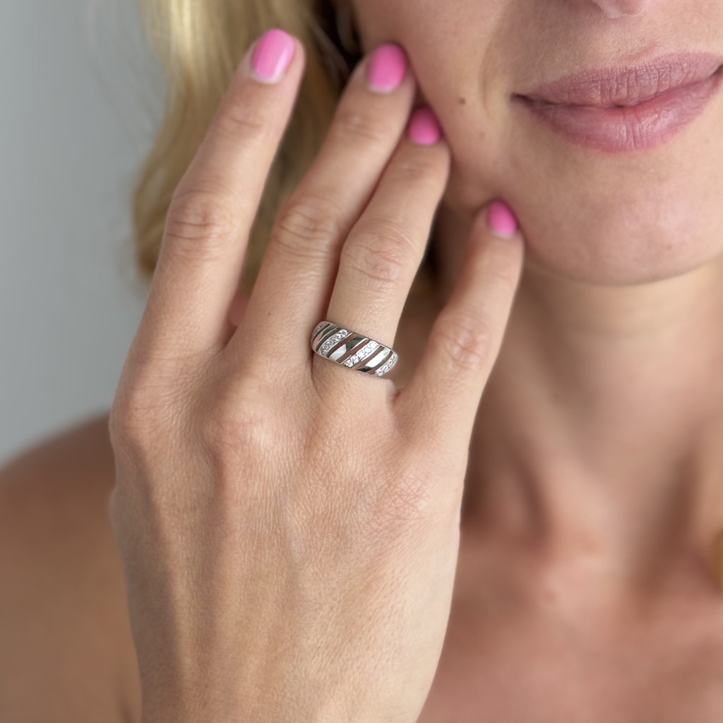 Powierzchnia pierścionka jest subtelnie ozdobiona błyszczącymi cyrkoniami o średnicy 1 mm, które dodają biżuterii blasku i podkreślają jej luksusowy charakter. Każdy kamień jest starannie osadzony, aby podkreślić precyzję wykonania i doskonałość całej biżuterii.
