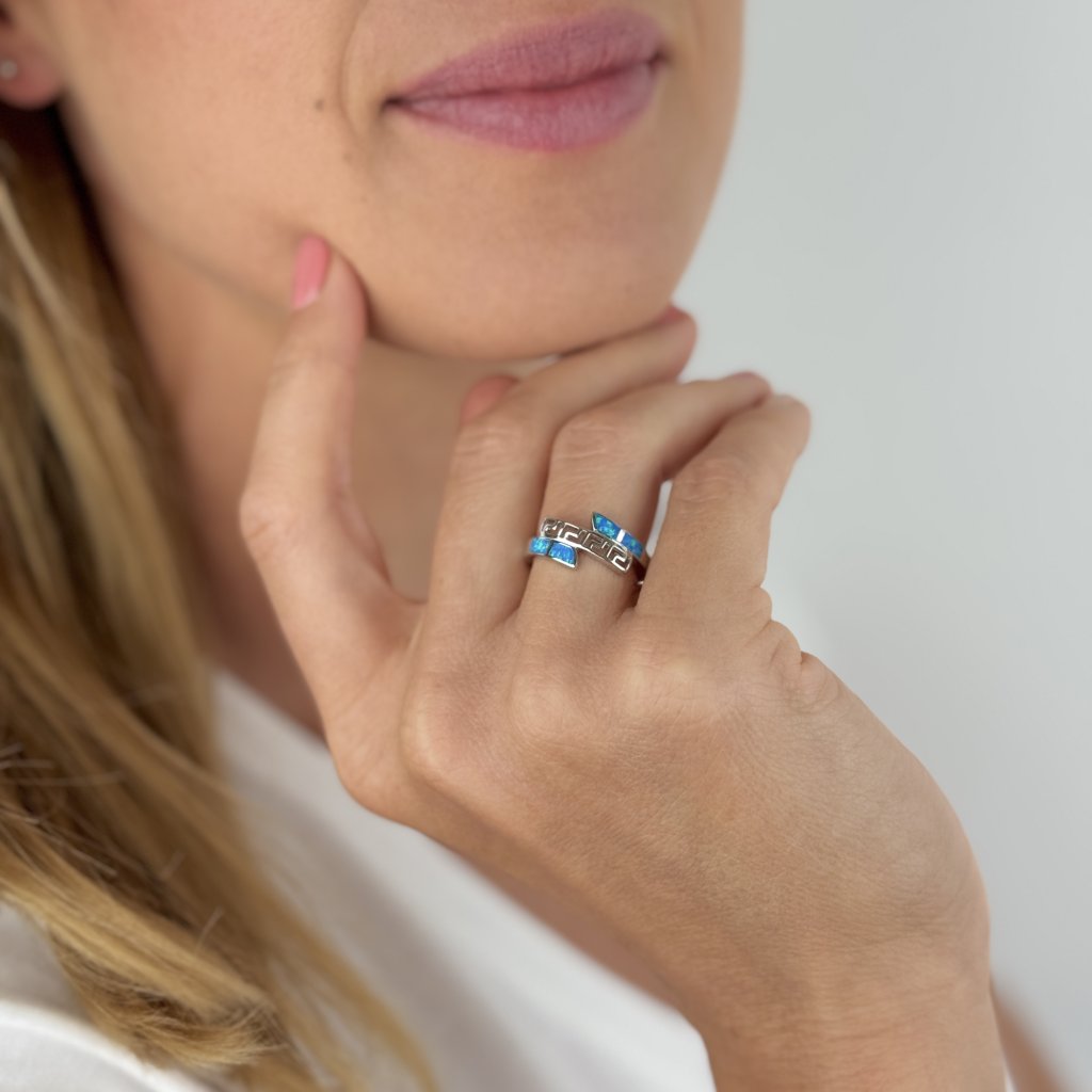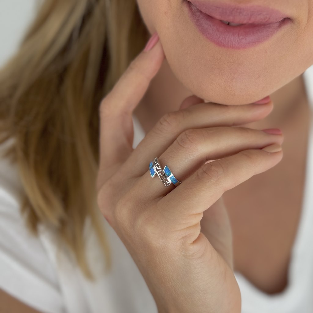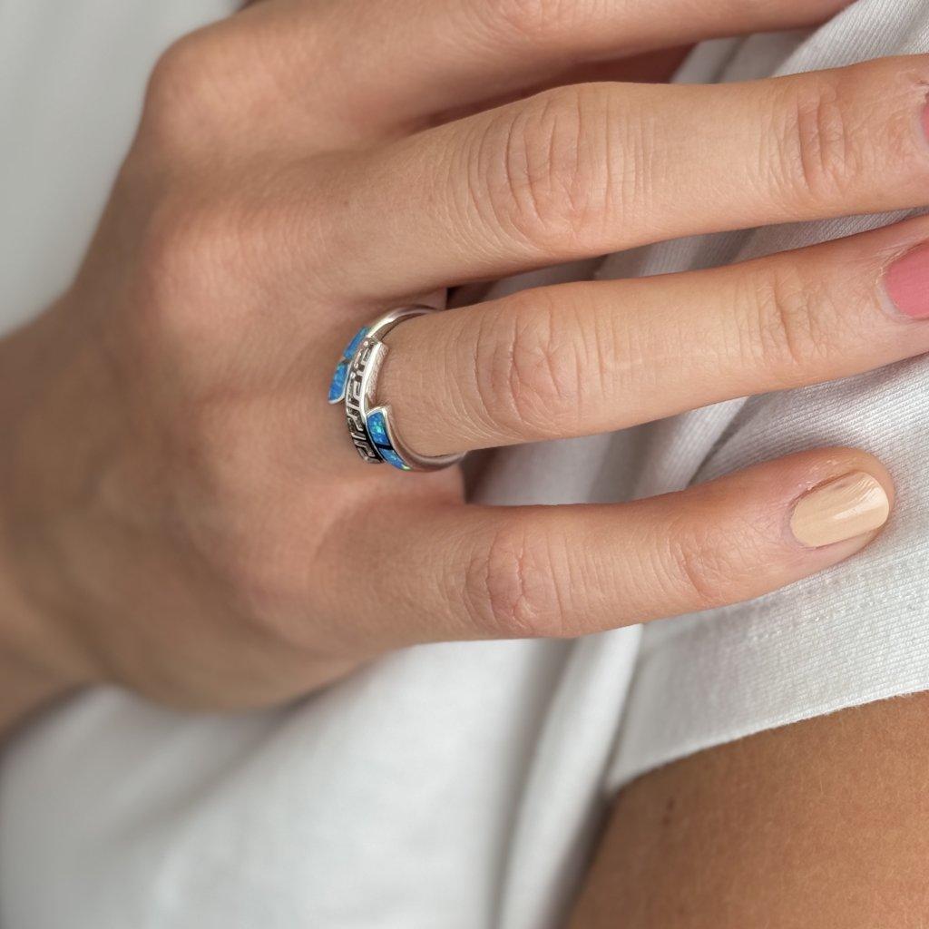 Srebrny pierścionek VADIM to idealne połączenie elegancji i mistycznego piękna. Jego dominantą jest fascynujący syntetyczny opal, który zachwyca grą kolorów – od delikatnych turkusów po głębsze odcienie niebieskiego. Przy każdym ruchu ręki i zmianie kąta padania światła odkrywa nowe spektrum barw.