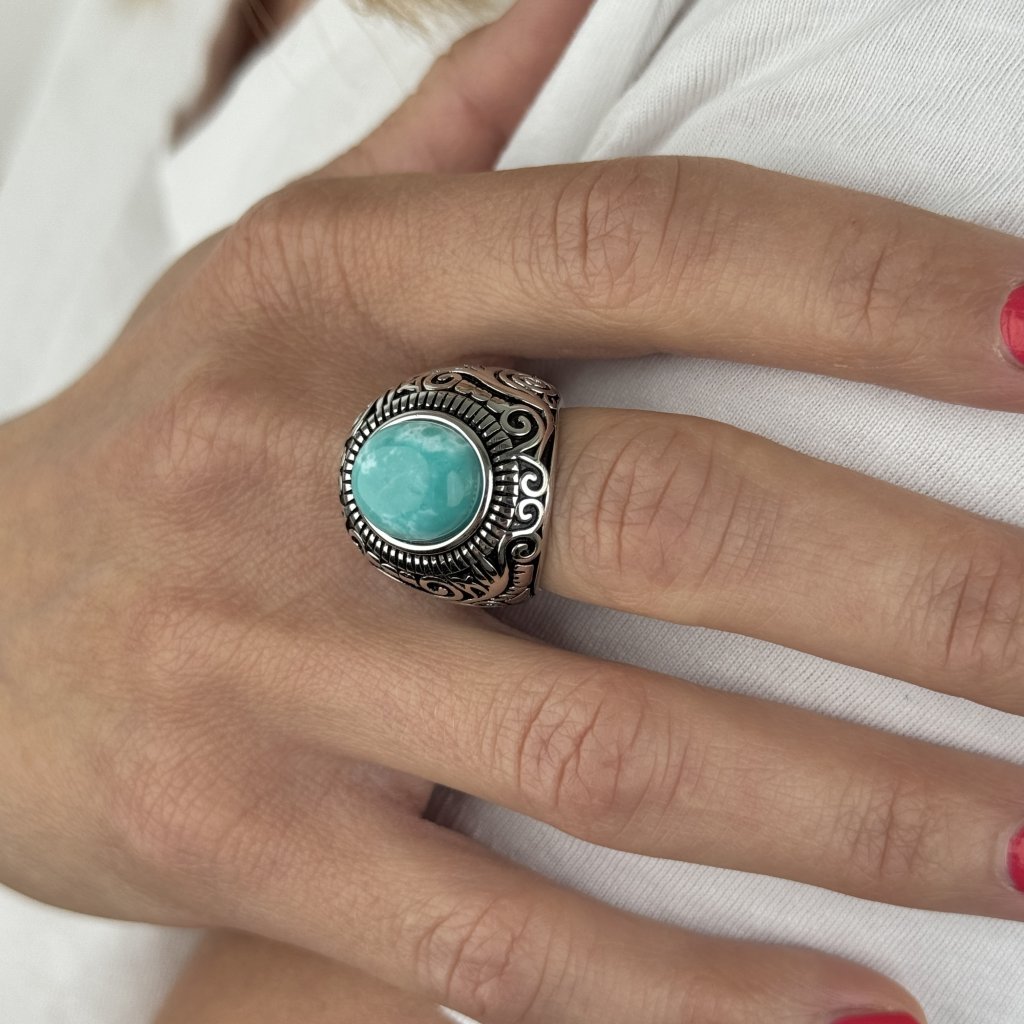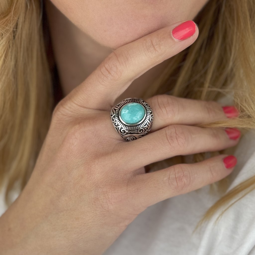 Srebrny pierścionek CASEY to mistrzowskie połączenie tradycyjnego rzemiosła z odważnym, nowoczesnym designem. Dominantą pierścionka jest wyrazisty syntetyczny turkus o wymiarach 10 × 12 mm, który efektownie dopełniają precyzyjnie wycinane czarne geometryczne motywy, tworzące fascynujący kontrast z lśniącym srebrem.