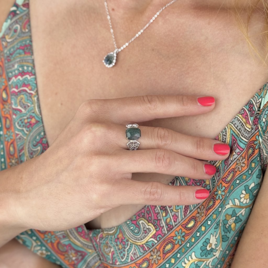 Pierścionek INSIGHT z agatem mszystym to harmonijne połączenie elegancji i naturalnego piękna. Jego nazwa, tłumaczona jako "wgląd" lub "zrozumienie", odzwierciedla zdolność tego kamienia do pomagania noszącej widzieć rzeczy z innej perspektywy i odnajdywać wewnętrzną mądrość.