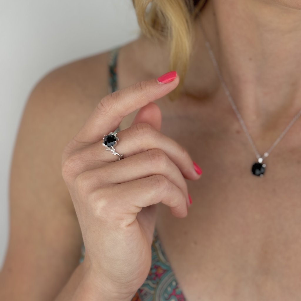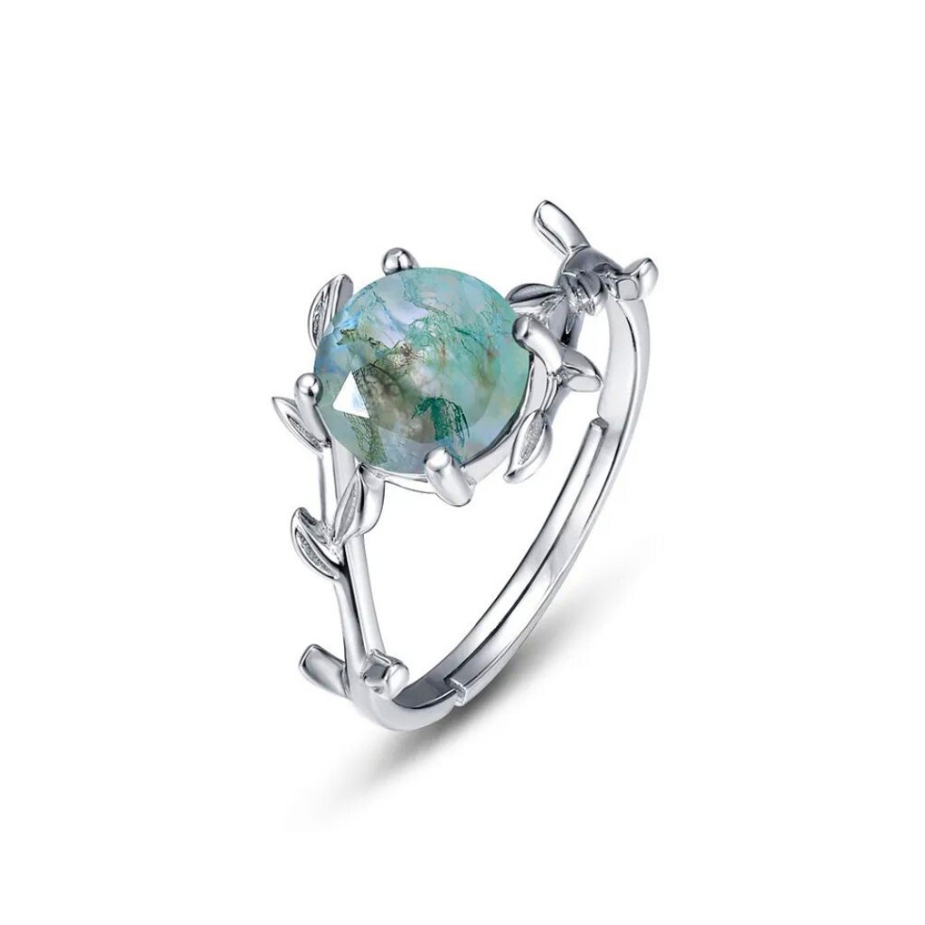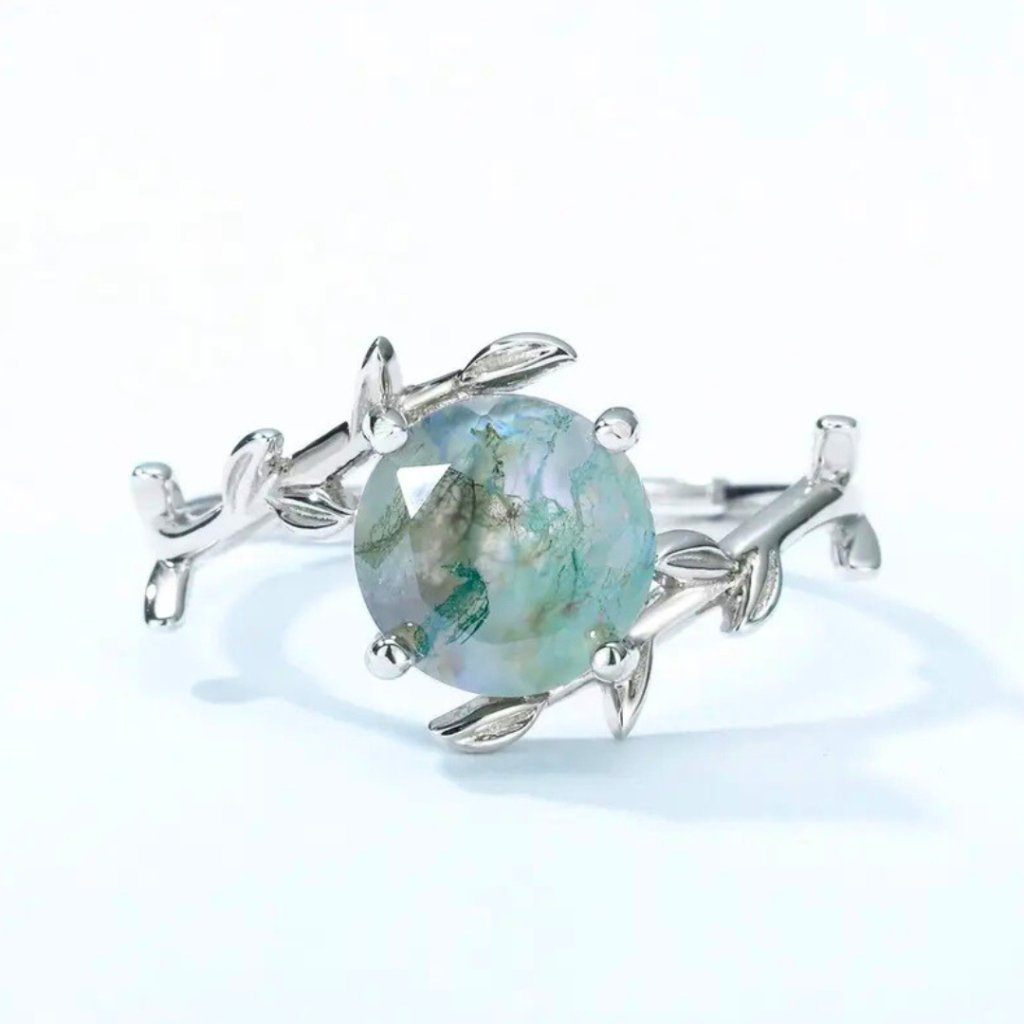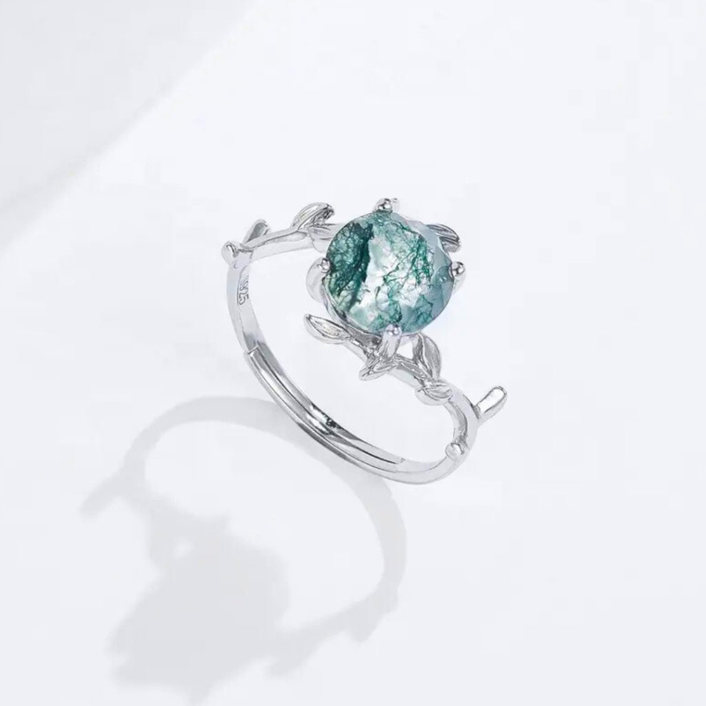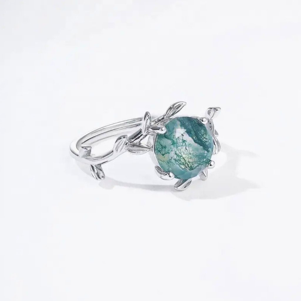 Centralnym elementem pierścionka jest wyjątkowy agat mszysty o średnicy 8 mm, który otoczony jest delikatnymi srebrnymi listkami. Ten design sprawia wrażenie, jakby kamień był osadzony w miniaturowym leśnym krajobrazie. Każdy agat mszysty jest unikalny, z własnym wzorem zielonych inkluzji, które przypominają tajemnicze leśne scenerie.
