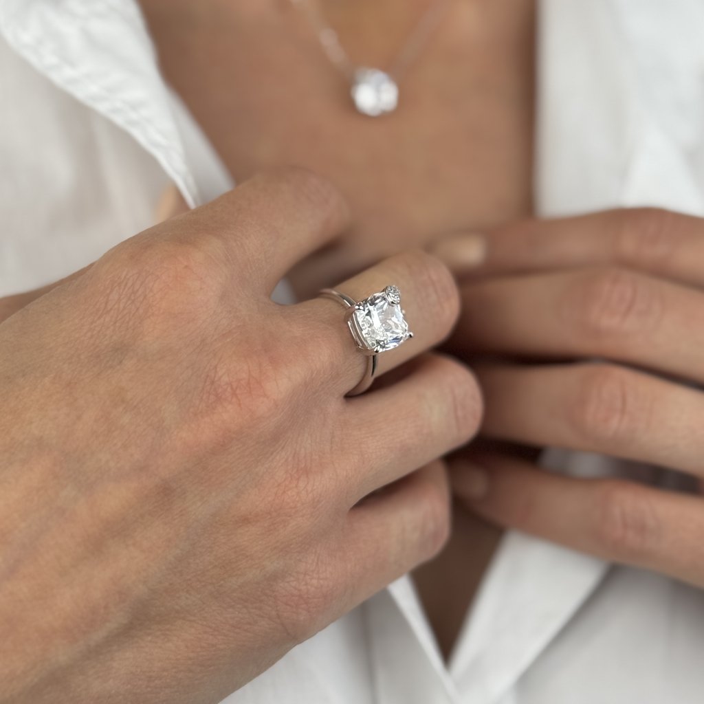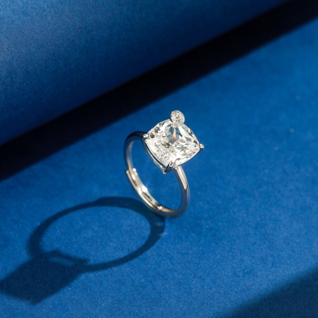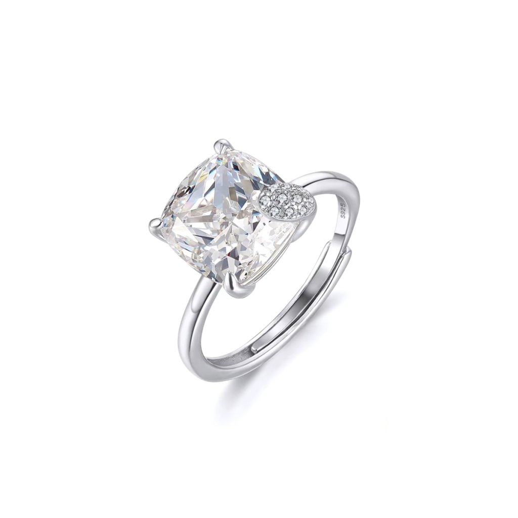 Srebrny pierścionek z regulacją AISHA to idealne połączenie elegancji i praktyczności. Wykonany jest z wysokiej jakości srebra próby Ag925/1000 i pokryty rodem, co gwarantuje jego długotrwały blask i ochronę przed zarysowaniami. Dominantą pierścionka jest duży cyrkon o wymiarach 10 × 10 mm, który lśni jak prawdziwy diament.