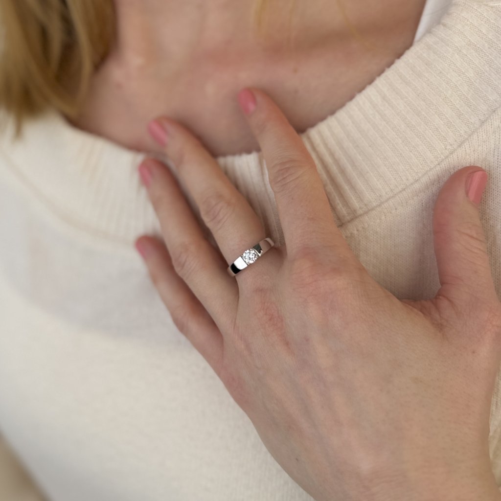 Pierścionek wykonany jest z wysokiej jakości srebra próby 925/1000 i pokryty rodem, co zapewnia długotrwały blask i ochronę przed utlenianiem. Dzięki swojej uniwersalności nadaje się jako pierścionek zaręczynowy i ślubny.