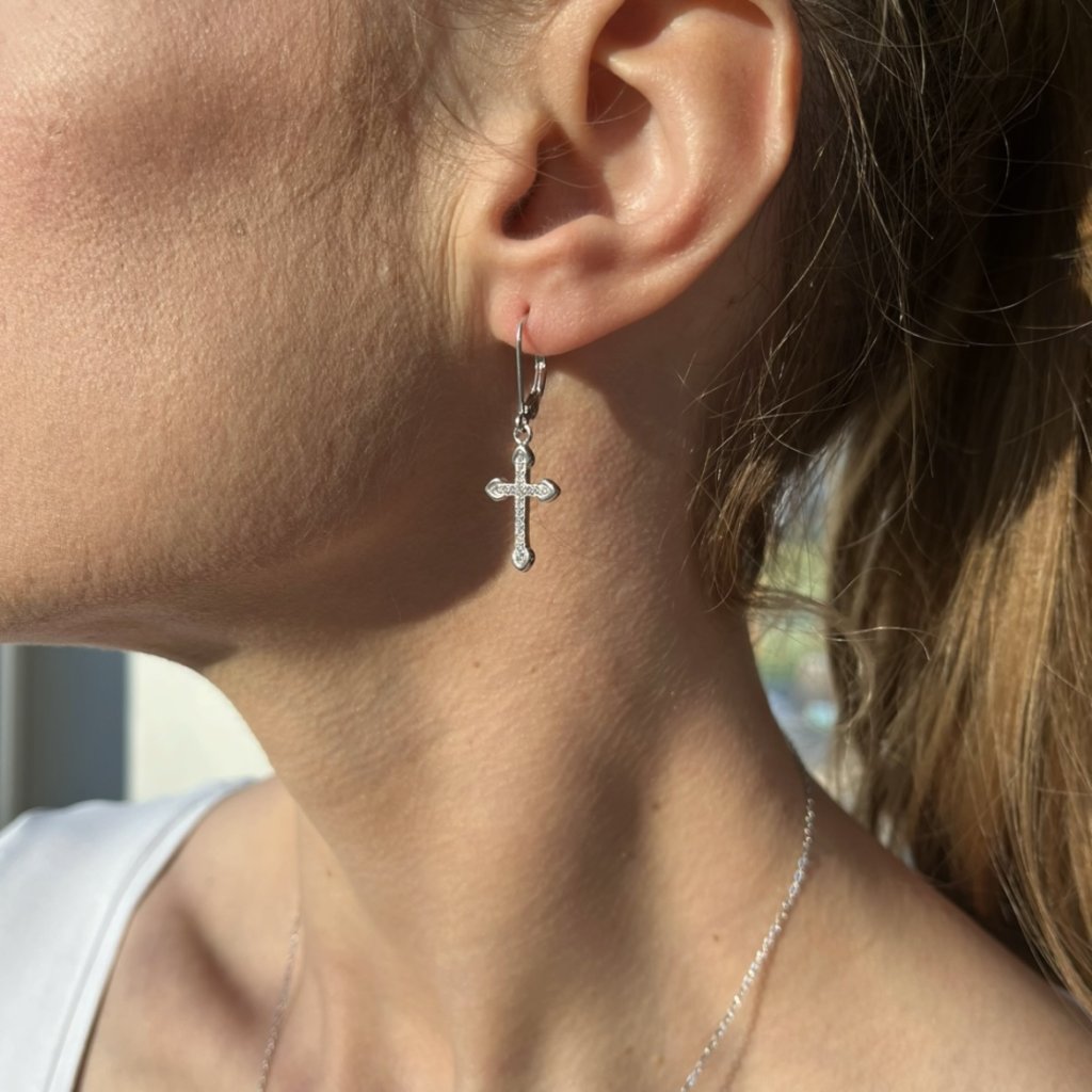 Ten zestaw, w skład którego wchodzą wiszące kolczyki i łańcuszek z zawieszką z motywem krzyża, wykonany jest ze srebra próby 925. Delikatny krzyżyk ozdobiony jest sześciennymi cyrkoniami, które doskonale uzupełniają jego elegancki wygląd. Wiszące kolczyki w kształcie krzyża są wyjątkowe i eleganckie. Zapięcie to patent damski, który gwarantuje bezpieczeństwo i wygodę.