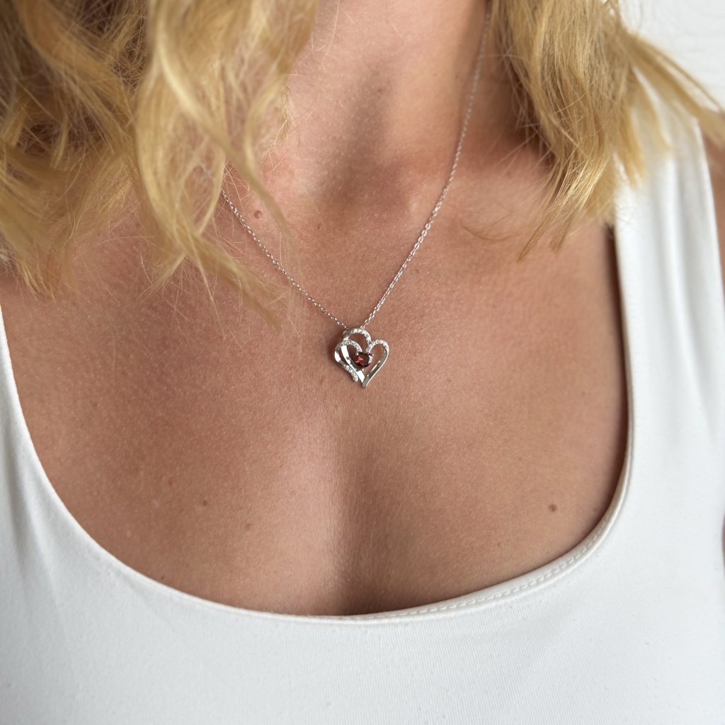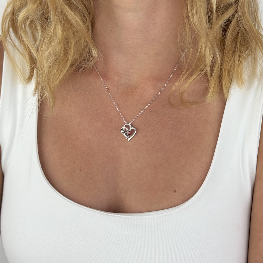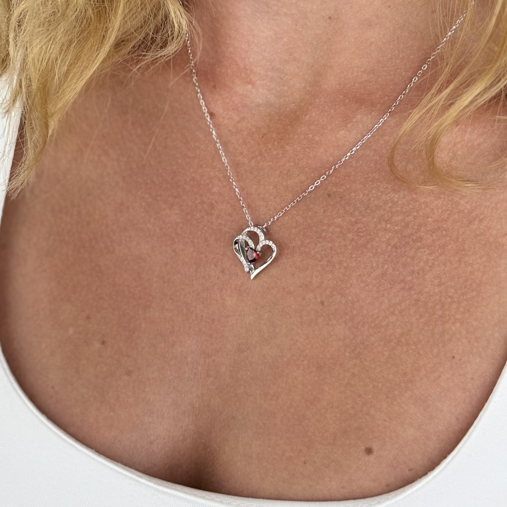 Srebrny łańcuszek z zawieszką w kształcie dwóch splecionych serc z czerwonymi kryształkami to idealny prezent, aby wyrazić swoją miłość i oddanie. To prezent, który mówi: "Nasze serca są na zawsze połączone miłością i pasją"