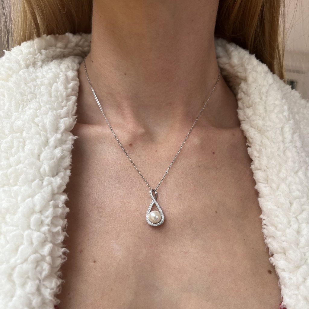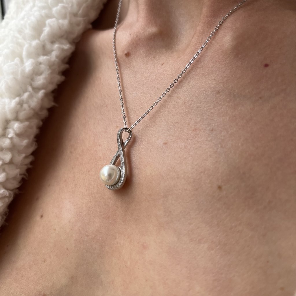 Wisiorek wykonany jest z wysokiej jakości srebra próby 925 i wysadzany cyrkoniami. W centrum uwagi znajduje się jednak piękna perła o średnicy 8 mm, która nadaje klejnotowi wyjątkowe znaczenie i piękno.