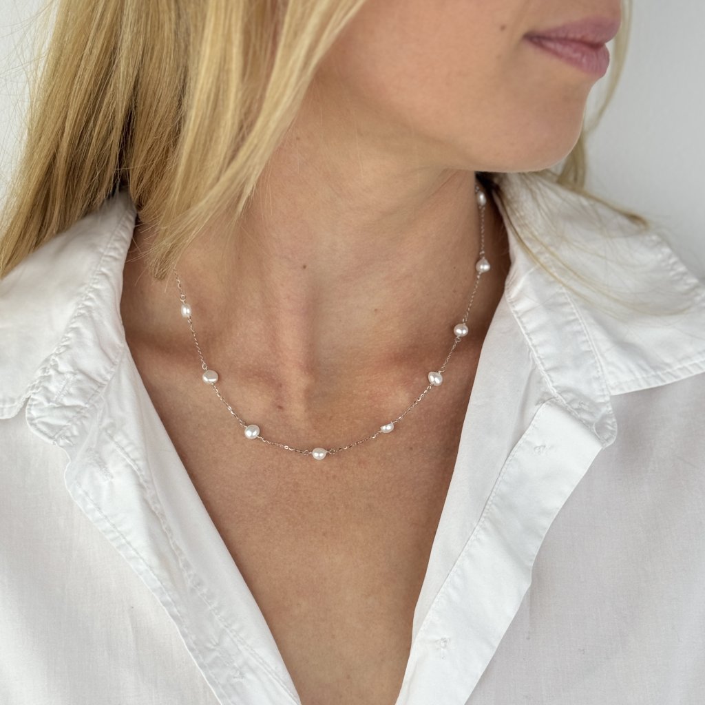 Przedstawiamy srebrny łańcuszek ELLIS - klejnot, który łączy w sobie czystość srebra i urok pereł. Ta wspaniała biżuteria wykonana jest z wysokiej jakości srebra próby 925 i ma rodowane wykończenie, aby zapewnić długotrwały połysk i trwałość.