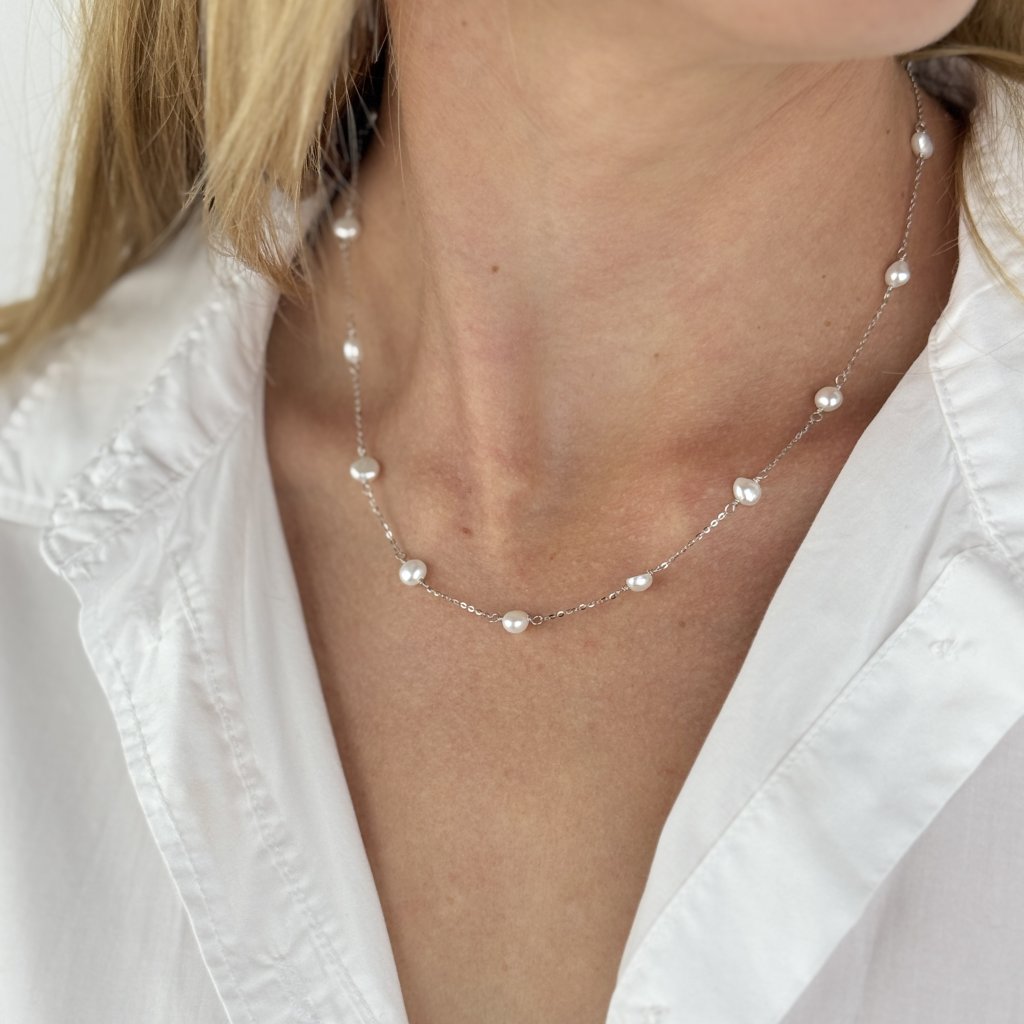 Łańcuszek ozdobiony jest perłami o średnicy 6 mm, które nadają mu elegancki i wyrafinowany wygląd. Dzięki długości 42 + 5 cm wygodnie dopasowuje się do dekoltu i daje możliwość noszenia go w różnych stylach.