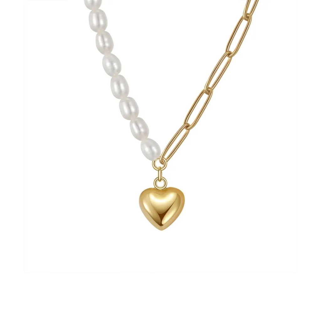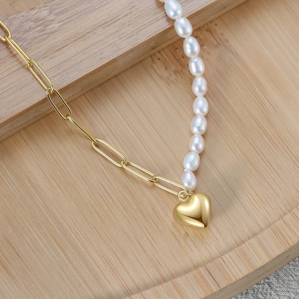 Pierwsza połowa łańcuszka jest wysadzana małymi perłami o szerokości 6 mm, które nadają klejnotowi delikatności i elegancji. Druga część składa się z łańcuszka w stylu Paperclip, który wnosi nowoczesny i minimalistyczny akcent. Na środku łańcuszka wisi pozłacane serduszko o wymiarach 10 × 10 mm, które pięknie wpada w dekolt i stanowi centralny punkt całego naszyjnika.