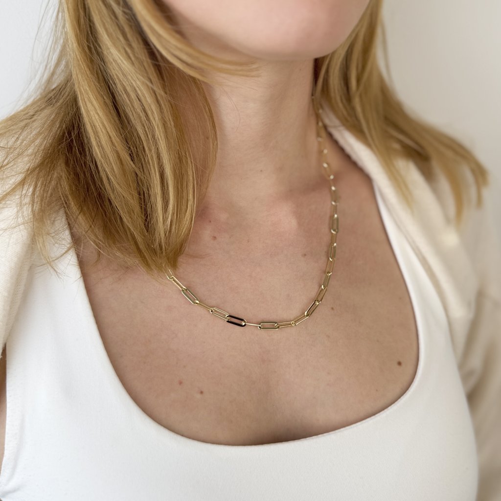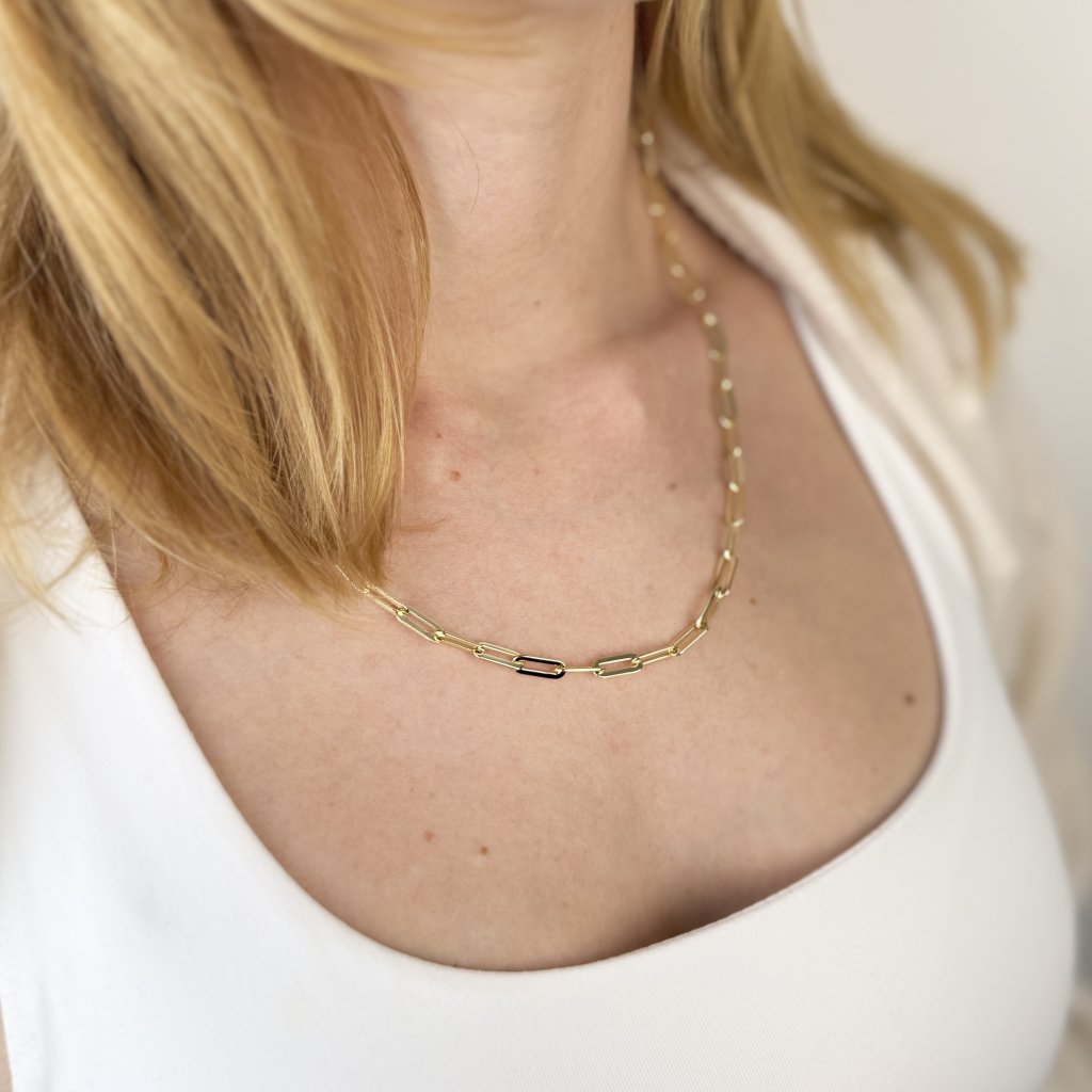 Łańcuszek wykonany jest z wysokiej jakości srebra próby 925/1000 i pokryty luksusowym pozłoceniem 14K złotem, co nadaje biżuterii prestiżowy wygląd i zapewnia długotrwały blask. Wyjątkowo szeroka wersja designu Paperclip jest obecnie na szczycie popularności i doskonale nadaje się do noszenia samodzielnie.