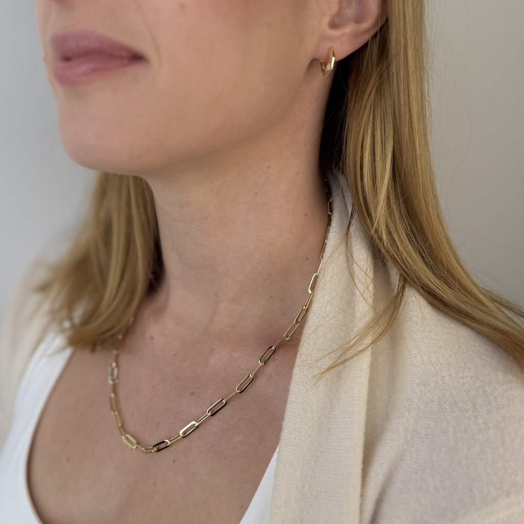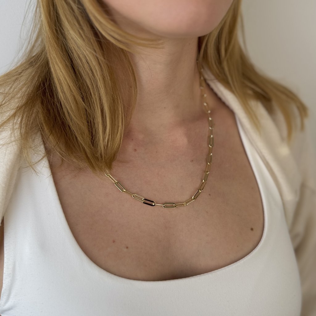 Pozłacany łańcuszek HENRY to szczytowy przykład aktualnego trendu Paperclip. Jego masywne ogniwa o szerokości 12 mm tworzą efektowny statement piece, który stanie się centralnym punktem każdej stylizacji. Długość 50 cm oferuje wszechstronne możliwości stylizacji i tworzy wyrazisty akcent modowy.