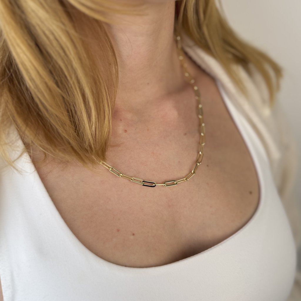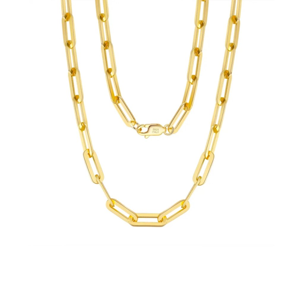 Łańcuszek wykonany jest z wysokiej jakości srebra próby 925/1000 i pokryty luksusowym pozłoceniem 14K złotem, co nadaje biżuterii prestiżowy wygląd i zapewnia długotrwały blask. Wyjątkowo szeroka wersja designu Paperclip jest obecnie na szczycie popularności i doskonale nadaje się do noszenia samodzielnie.