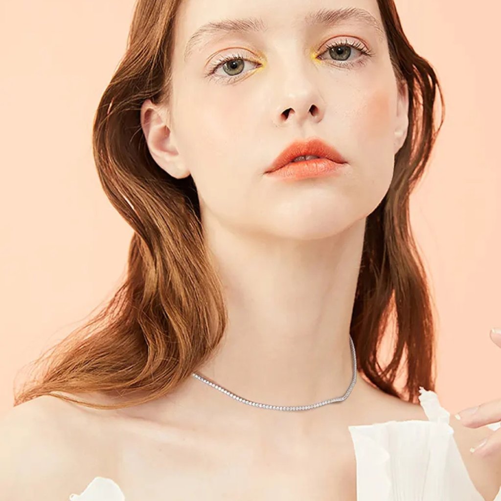 Srebrny naszyjnik tenisowy AMELIA to uosobienie luksusu i elegancji. Rząd błyszczących cyrkonii o imponującej szerokości 4 mm tworzy oszałamiający efekt świetlny, który przyciąga uwagę. Dzięki regulowanej długości 55+5 cm możesz nosić naszyjnik na różne sposoby i wysokości.