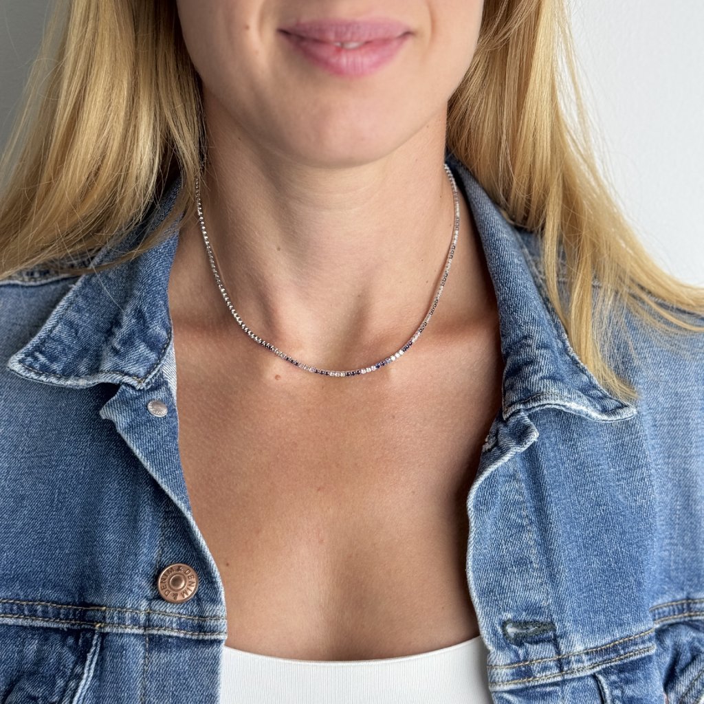 Naszyjnik wykonany jest z wysokiej jakości srebra próby 925/1000 i pokryty rodem, co zapewnia długotrwały blask i ochronę przed utlenianiem. Szerokość 2 mm doskonale równoważy wyrazistość kolorowych cyrkonii z eleganckim designem.