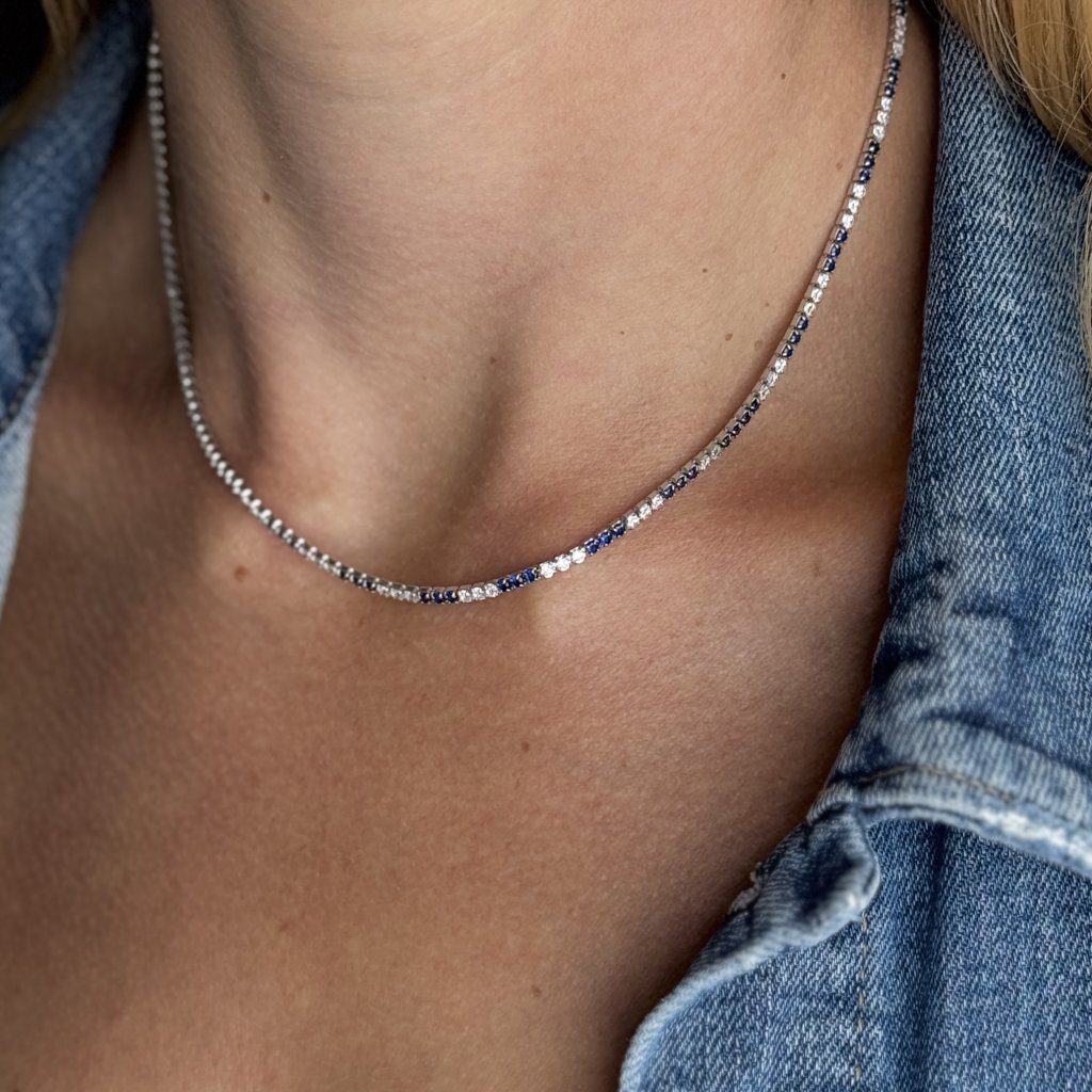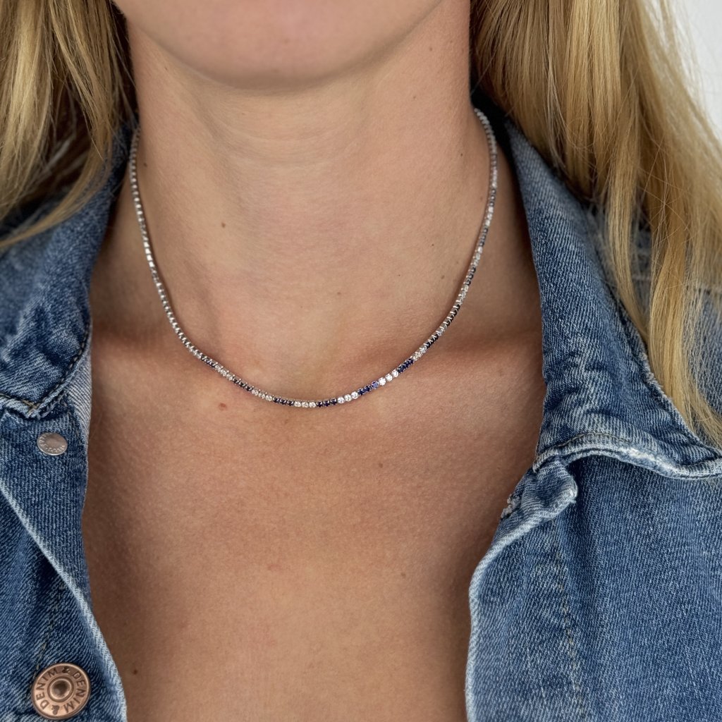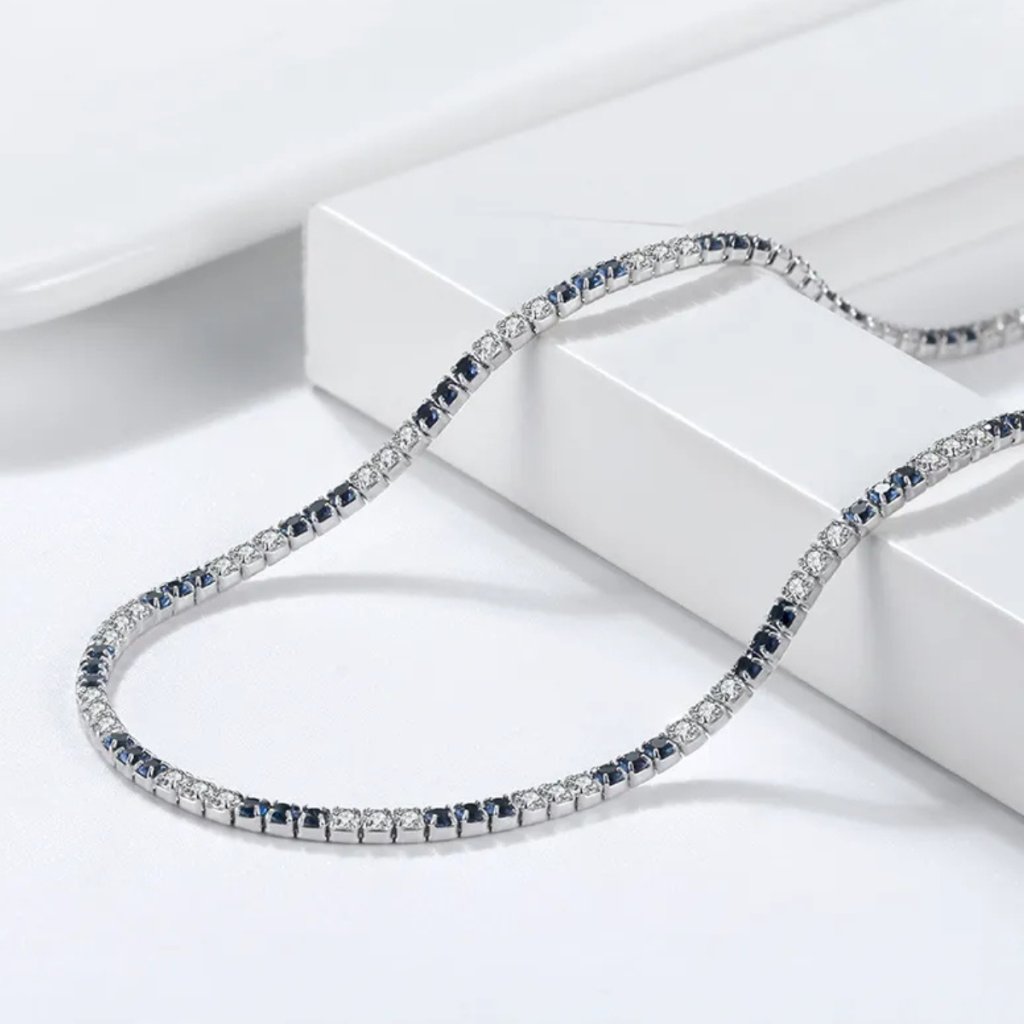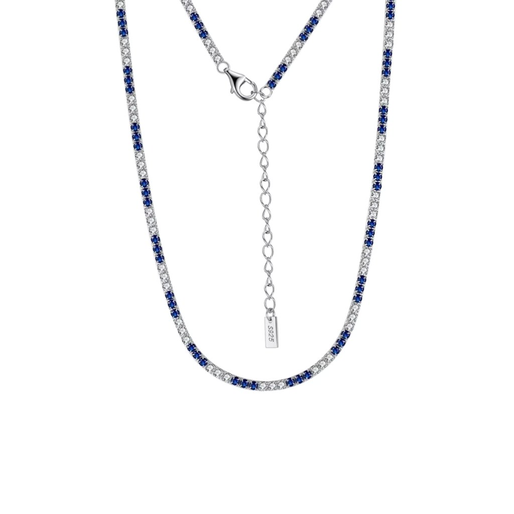 Srebrny naszyjnik typu choker ESMERA to mistrzowskie dzieło subtelności i wyrafinowania. Przemienność przezroczystych i niebieskich cyrkonii tworzy fascynującą harmonię świetlną, która nadaje biżuterii wyjątkowego charakteru. Dzięki regulowanej długości 36+5 cm dopasowuje się do każdego stylu noszenia blisko szyi.
