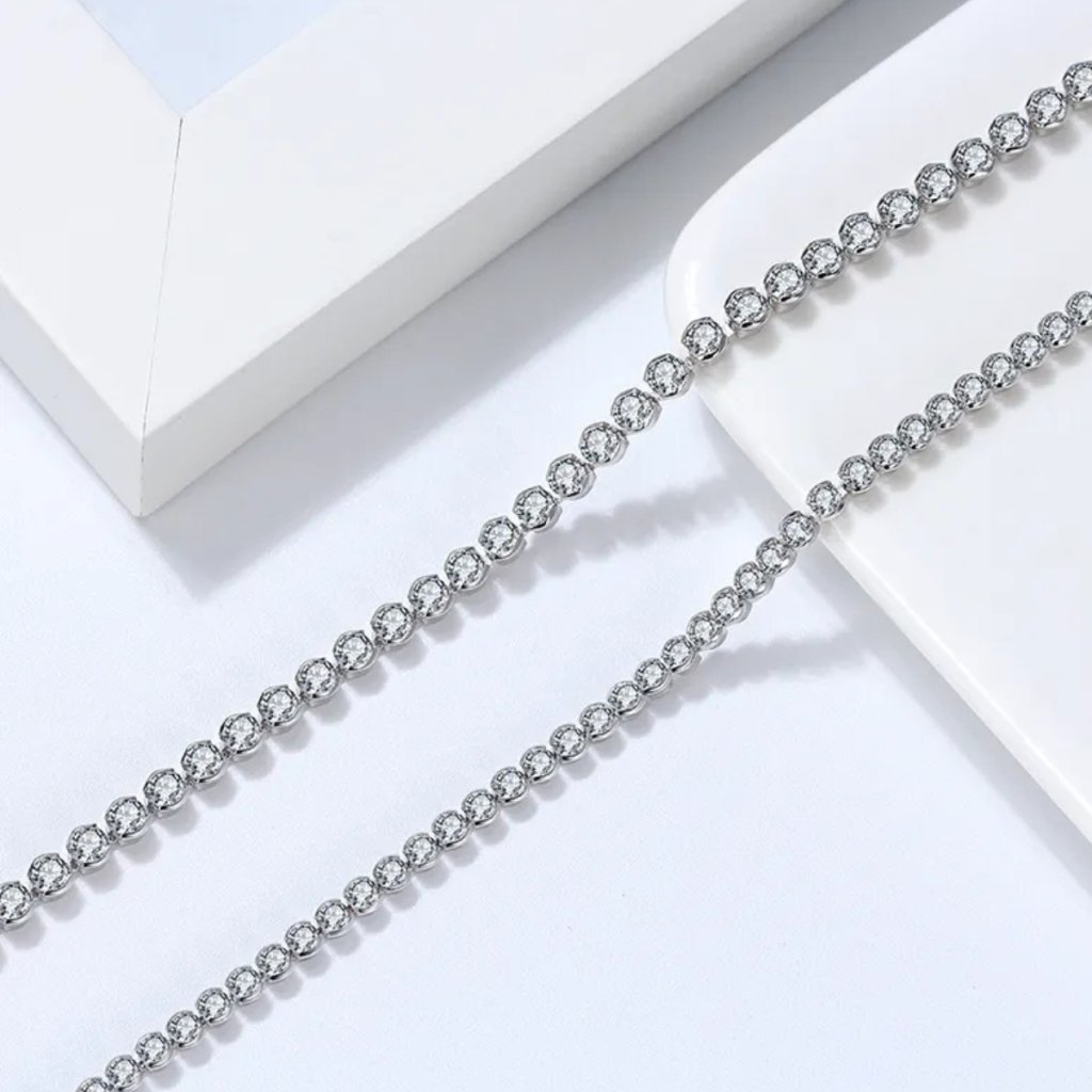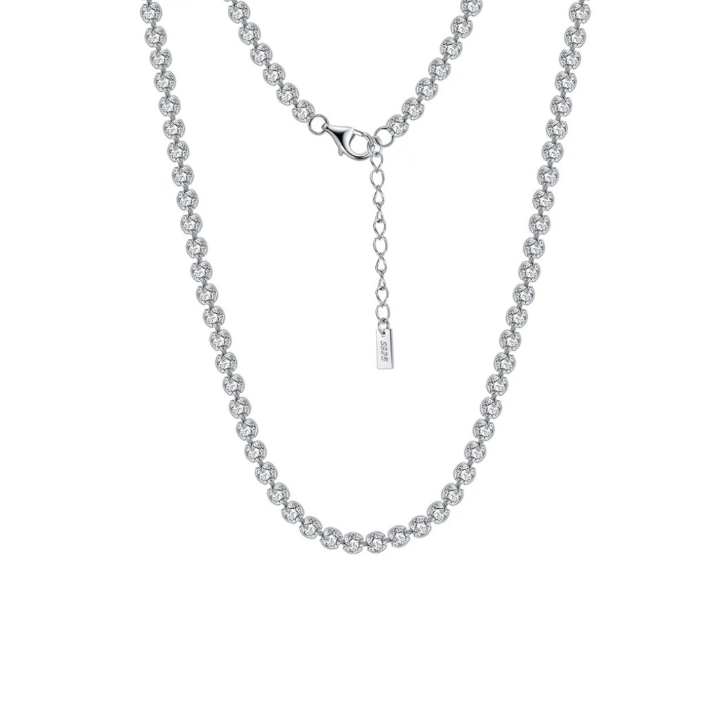 Srebrny naszyjnik tenisowy ERLENE to uosobienie nowoczesnej elegancji. Rząd lśniących cyrkonii w wyważonym układzie tworzy urzekającą linię światła, która nadaje biżuterii wyjątkowego charakteru. Dzięki regulowanej długości 55+5 cm dopasowuje się do każdego stylu noszenia.