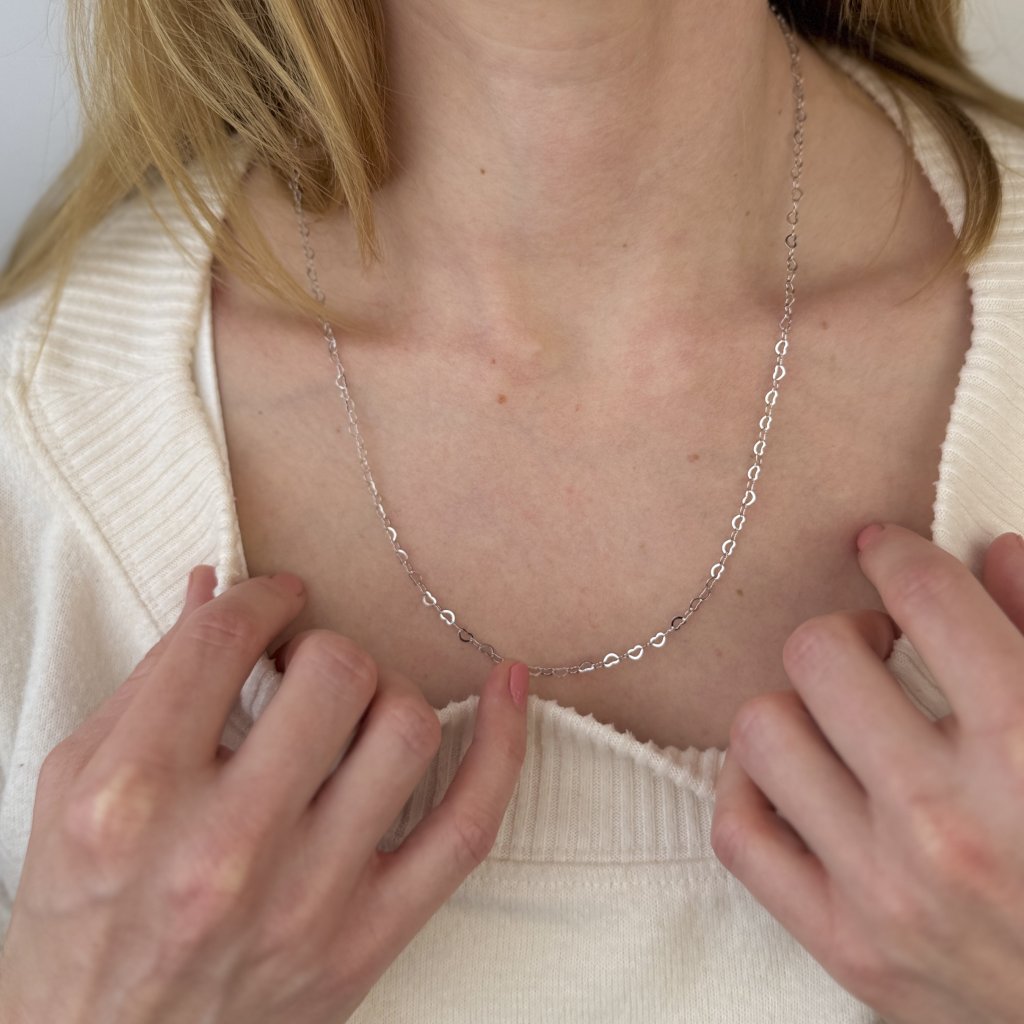 Łańcuszek wykonany jest z wysokiej jakości srebra próby 925/1000 i pokryty rodem, który chroni przed utlenianiem i zapewnia długotrwały połysk. Minimalistyczny design czyni tę biżuterię wszechstronnym dodatkiem, odpowiednim na co dzień i na specjalne okazje.