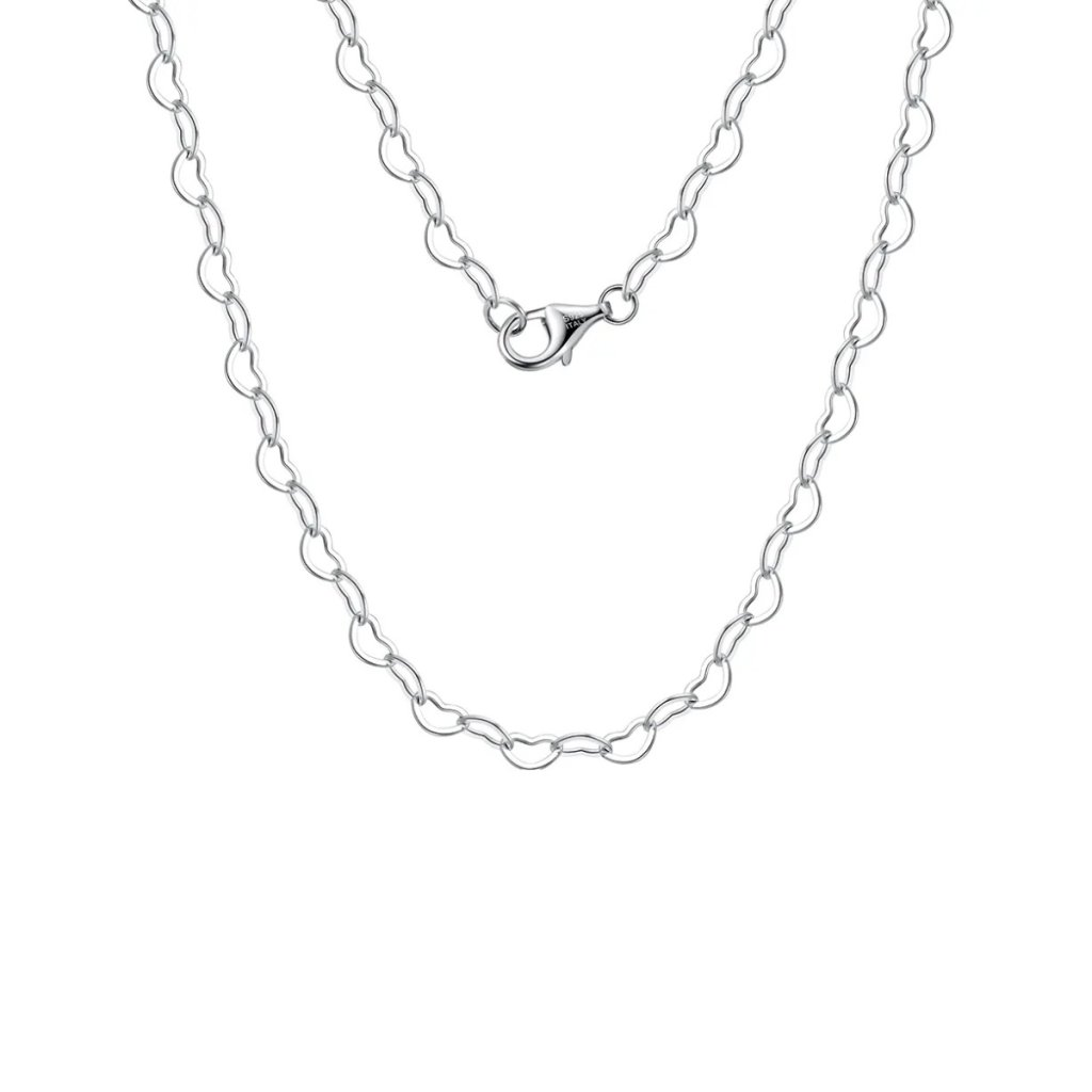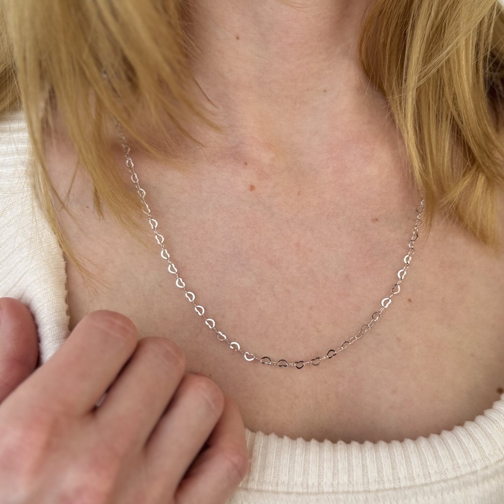 Srebrny łańcuszek YANIS to doskonała harmonia delikatności i elegancji. Jego design tworzą delikatne kontury serduszek o szerokości 2,8 mm, które wzajemnie się łączą, tworząc subtelny, romantyczny wzór. Długość 55 cm jest idealna do stworzenia lekkiego i swobodnego wyglądu.
