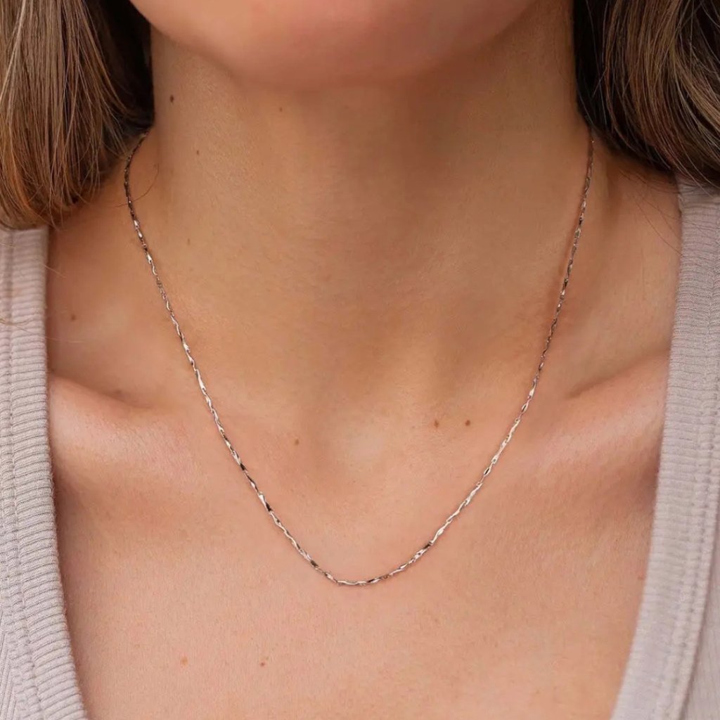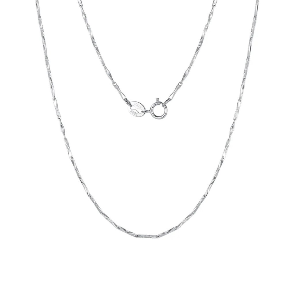 Przedstawiamy Państwu uroczy srebrny łańcuszek TYLOR, który łączy w sobie lekkość i elegancję. Ta rodowana biżuteria z czystego srebra próby 925/1000 została wykonana w unikalnym stylu Twisted Flake Chain, który tworzy delikatny, zwiewny wygląd.