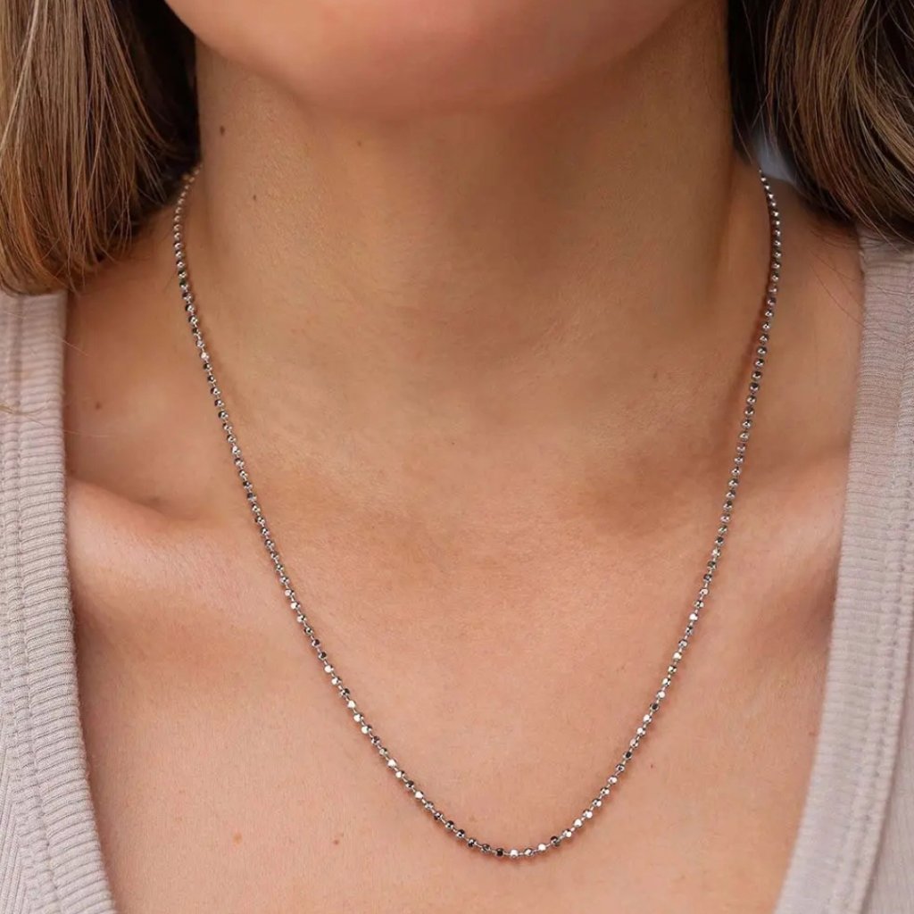 Łańcuszek składa się z szeregu drobnych kuleczek o szerokości 1 mm, które są połączone w jedną harmonijną całość. Długość 45 cm jest idealna do uniwersalnego noszenia – możesz nosić go samodzielnie, aby uzyskać minimalistyczny wygląd, lub dodać zawieszkę. Pasuje również do warstwowego noszenia z innymi łańcuszkami, tworząc nowoczesny wygląd.