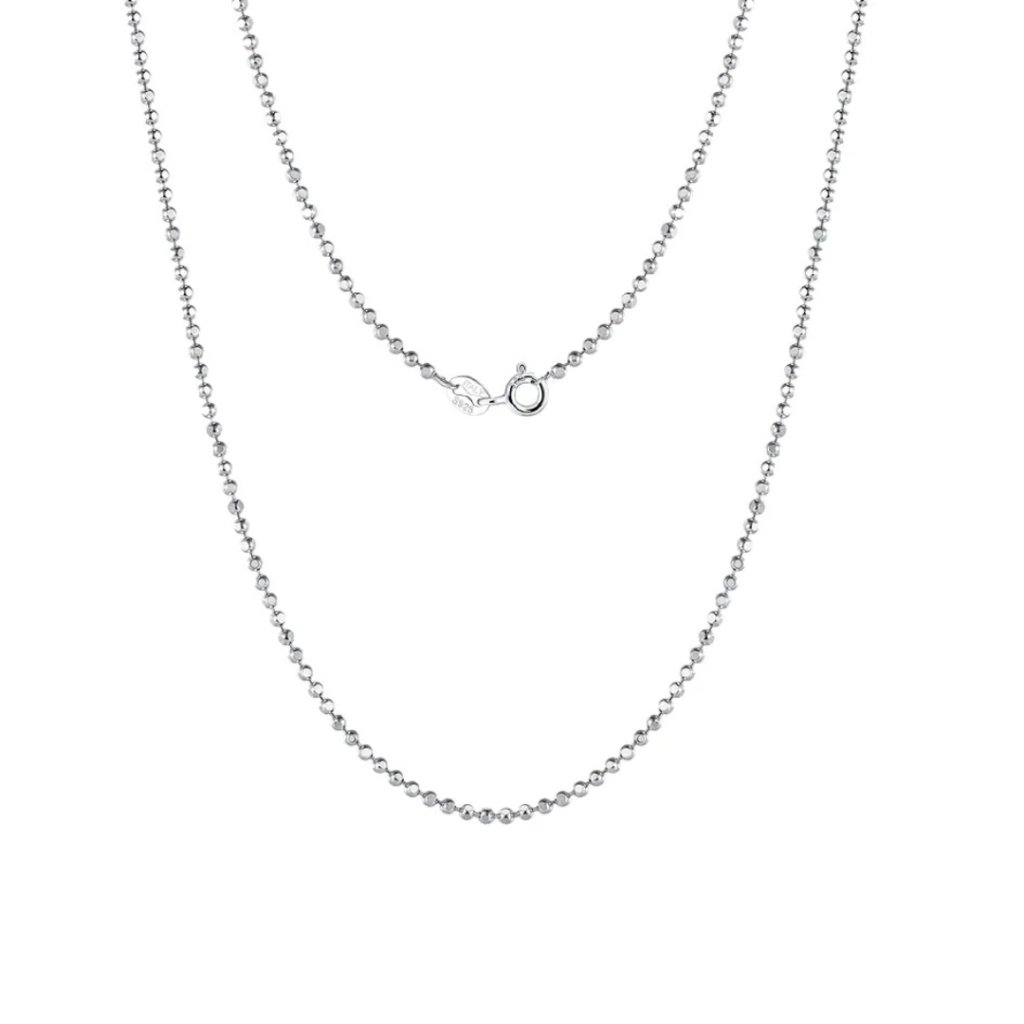 Łańcuszek składa się z szeregu drobnych kuleczek o szerokości 1,5 mm, które są połączone w jedną harmonijną całość. Dzięki większej szerokości prezentuje się bardziej wyraziście niż zwykłe łańcuszki, co czyni go dodatkiem przyciągającym wzrok, a jednocześnie subtelnym. Długość 55 cm oferuje więcej możliwości stylizacji – możesz go nosić swobodnie opadający, aby uzyskać efektowny wygląd, lub uzupełnić go wyrazistą zawieszką. Dłuższa wersja idealnie nadaje się również do łączenia z krótszymi łańcuszkami.
