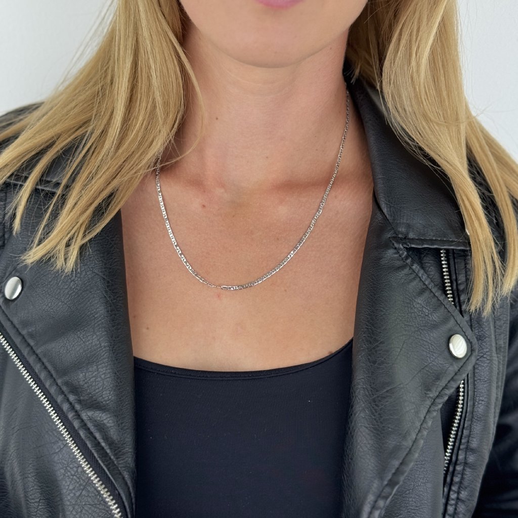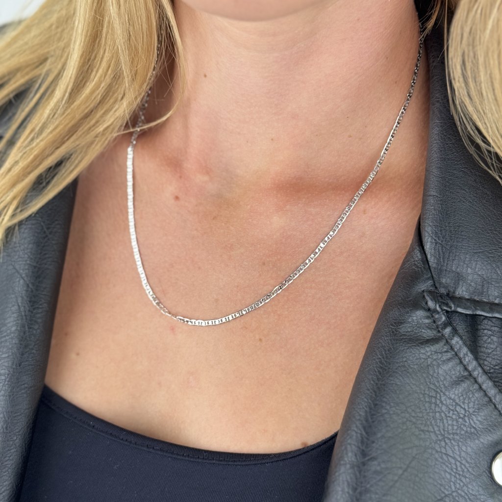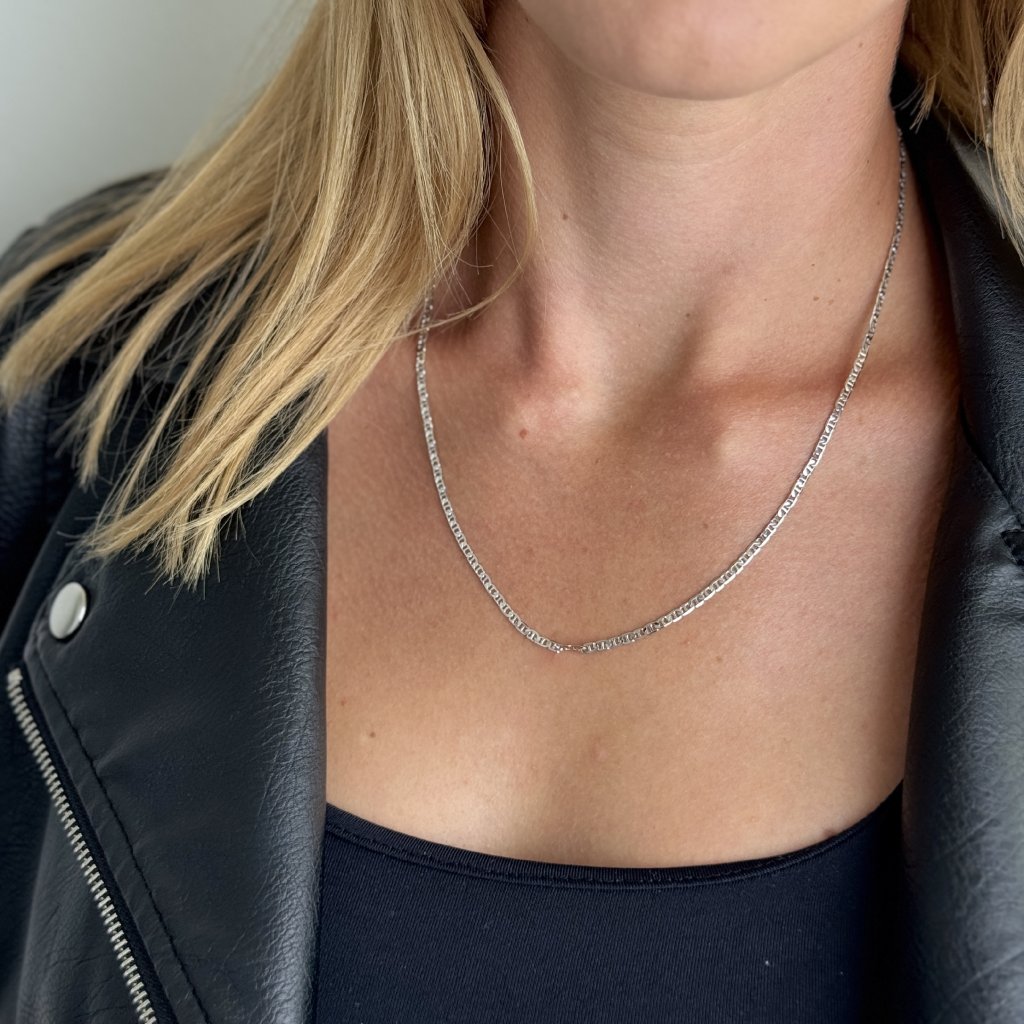 Srebrny łańcuszek FABIEN o długości 50 cm to mistrzowskie połączenie elegancji i nowoczesnego designu. Styl Flat Mariner z charakterystycznymi płaskimi, wzajemnie połączonymi ogniwami tworzy efektowny, a zarazem subtelny wygląd, który przyciąga uwagę.