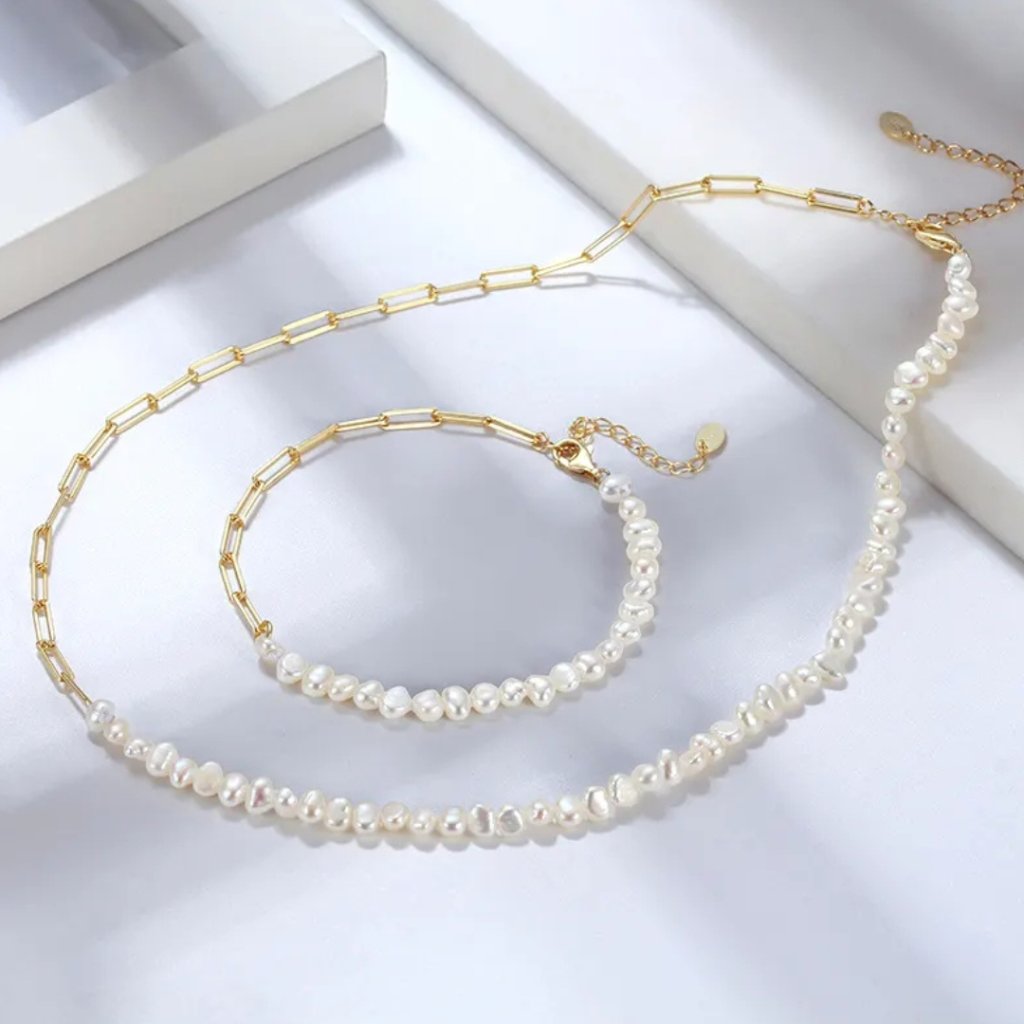 Przedstawiamy Państwu ekskluzywny, pozłacany naszyjnik MARGIT, który łączy klasyczną elegancję pereł z nowoczesnym designem łańcuszka Paperclip. Ta wyjątkowa biżuteria wykonana jest z wysokiej jakości srebra próby 925/1000 i pokryta luksusowym 14-karatowym złotem, co nadaje jej szlachetny wygląd.