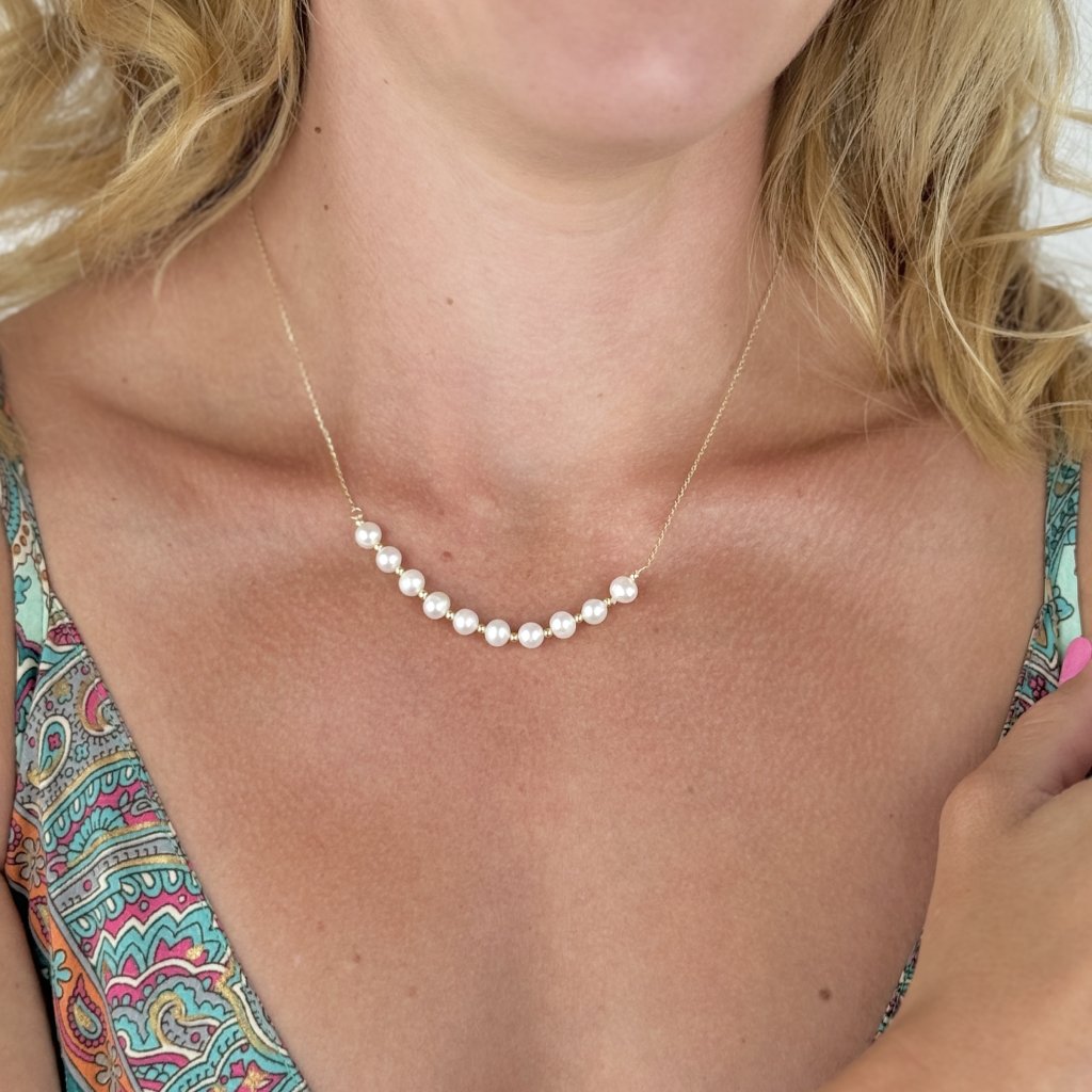 Oczaruj się pozłacanym łańcuszkiem TARA, który wprowadza harmonię złota i pereł. Ta wyjątkowa biżuteria wykonana jest z najwyższej próby srebra 925/1000 i pokryta luksusowym 14-karatowym złotem. Przednią część łańcuszka zdobią naprzemiennie ułożone perły o średnicy 6 mm i pozłacane kuleczki, tworzące efektowny design.