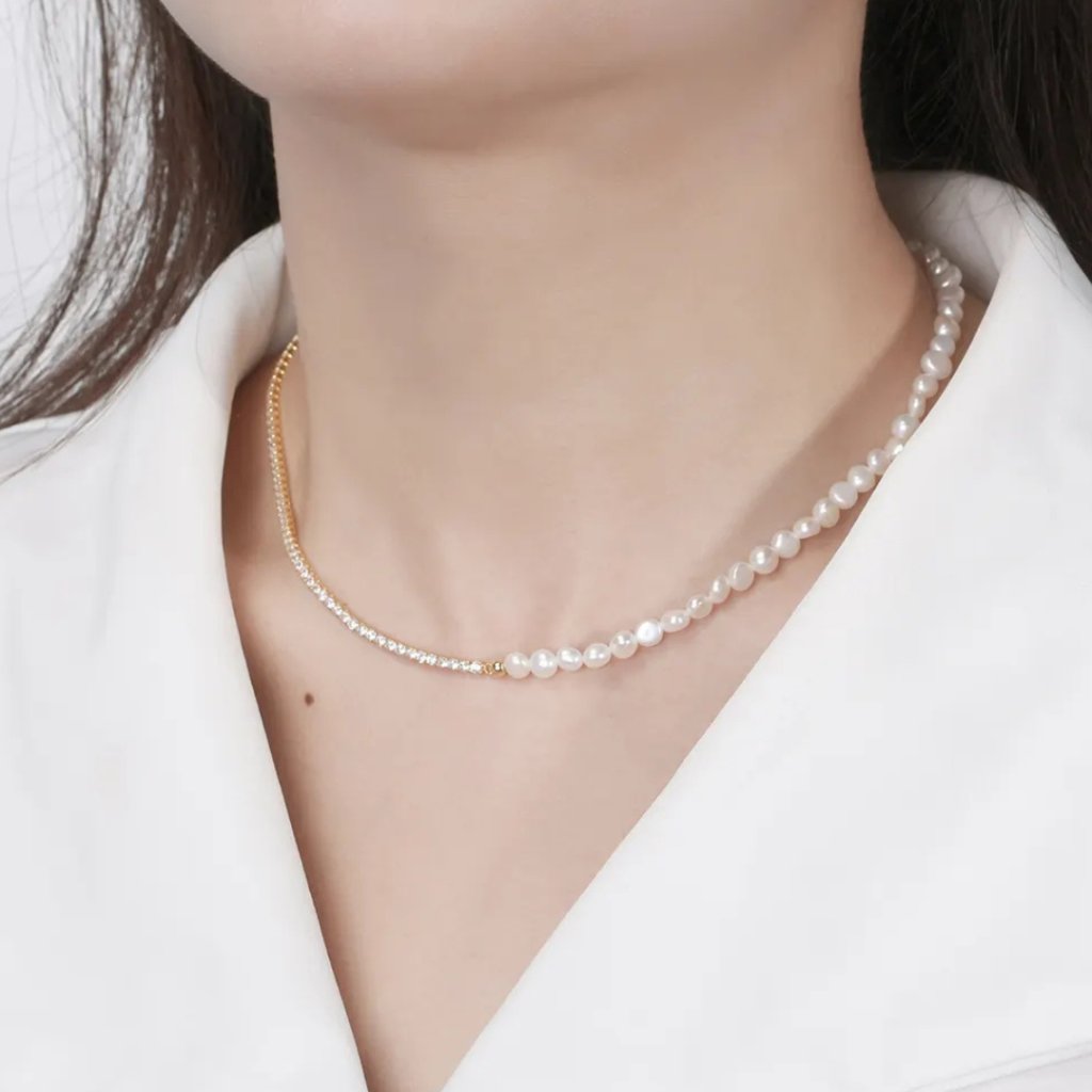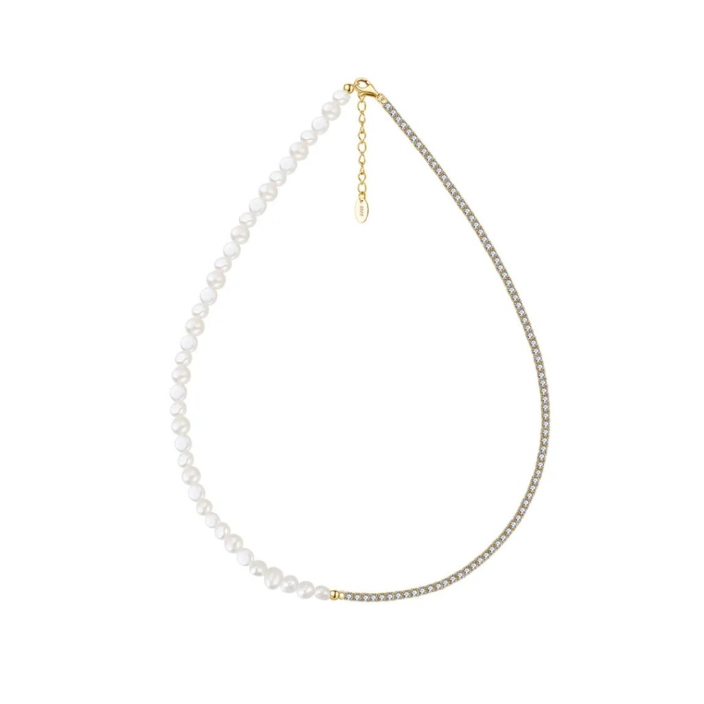 Oczaruj się wyjątkowym naszyjnikiem EILEEN, który łączy klasyczną elegancję pereł z nowoczesnym tenisowym designem. Ta wyjątkowa biżuteria jest wykonana z wysokiej jakości srebra próby 925/1000 i pokryta luksusowym 14-karatowym złotem. Pierwsza połowa naszyjnika składa się z pięknych pereł słodkowodnych o szerokości 6 mm, a druga część zachwyca rzędem błyszczących cyrkonii w tenisowym stylu.