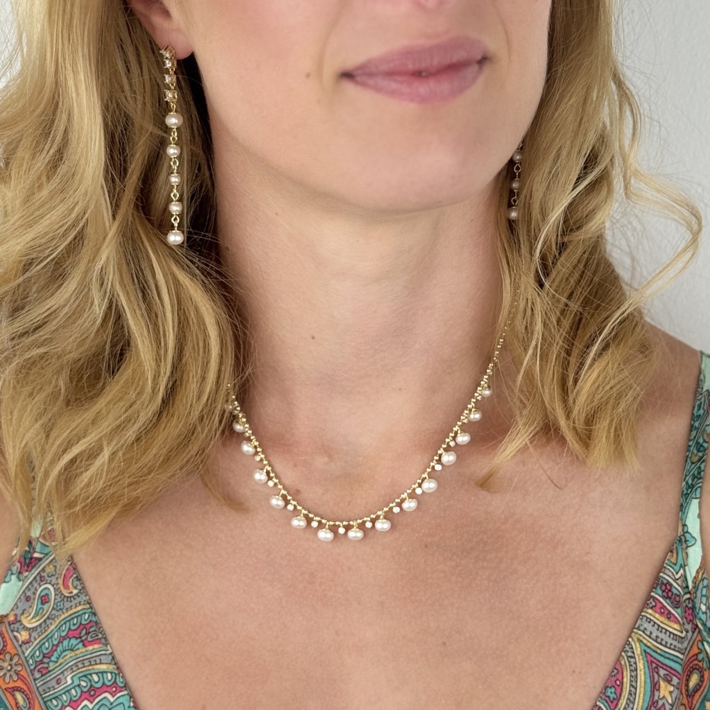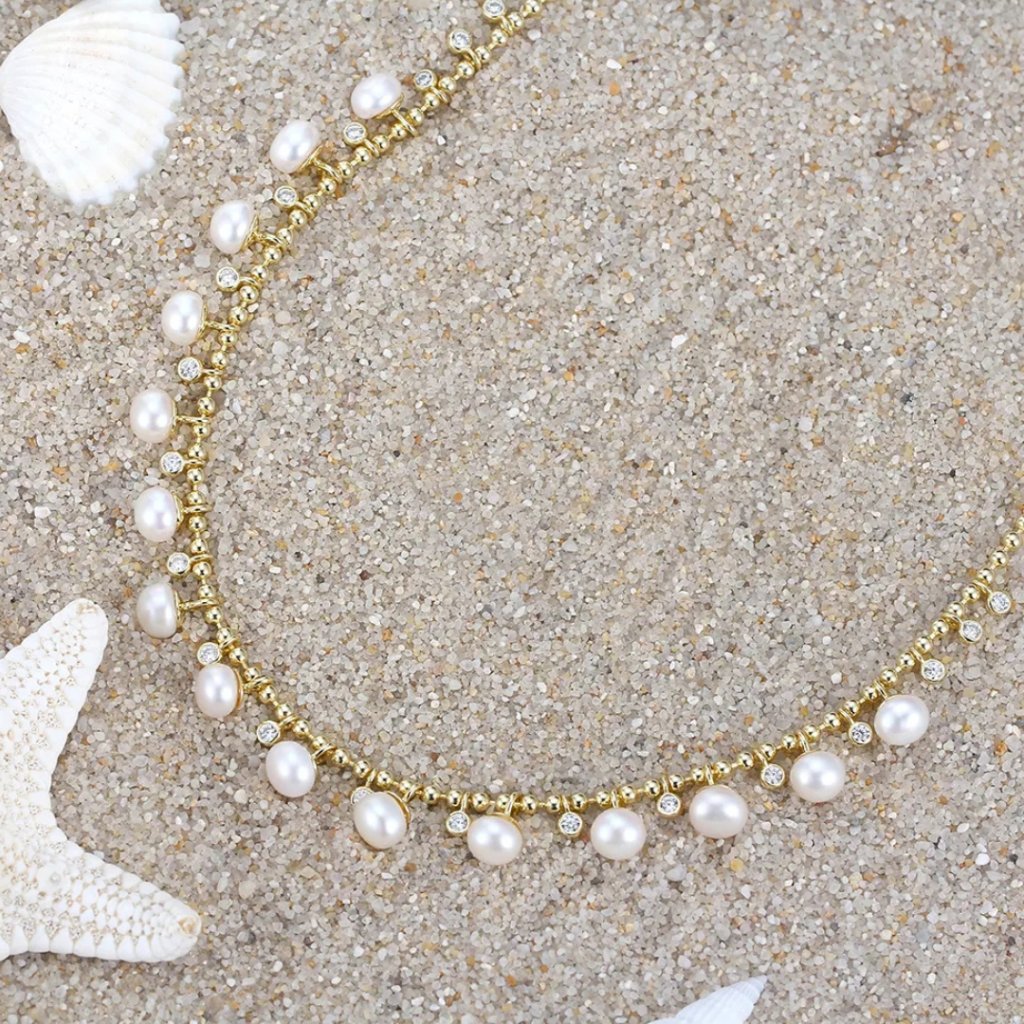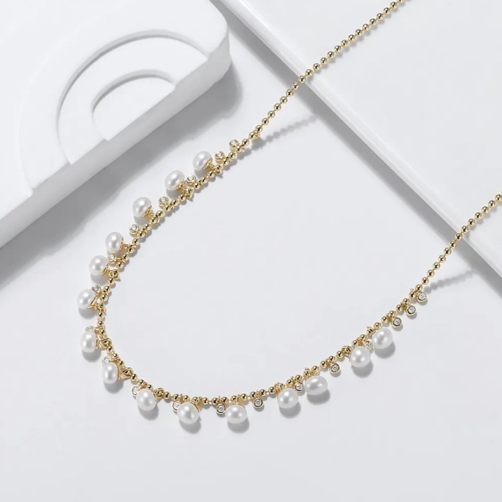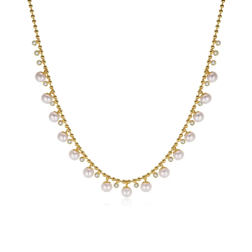 Odkryj wyjątkowość pozłacanego łańcuszka JUNE, który wnosi nową interpretację klasycznej biżuterii. Wykonany z najwyższej jakości srebra próby 925/1000 z luksusowym 14-karatowym złoceniem. Łańcuszek łączy styl Pearl and Beads, gdzie przednią część zdobią słodkowodne perły o średnicy 5 mm wraz z błyszczącymi cyrkoniami o wielkości 1 mm.