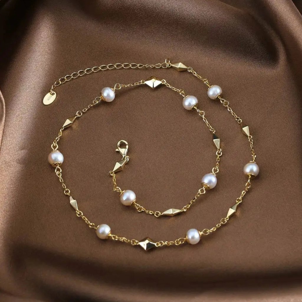 Przedstawiamy Państwu biżuterię, która łączy klasyczną elegancję z nowoczesnym designem - pozłacany łańcuszek TAMARA. Ten wyjątkowy element wykonany jest z wysokiej jakości srebra próby 925/1000 i pokryty luksusowym 14-karatowym złotem. Łańcuszek w stylu Link jest wyjątkowo ozdobiony słodkowodnymi perłami o średnicy 5 mm i geometrycznymi ośmiościanami o długości 7 mm, które tworzą fascynujący kontrast.