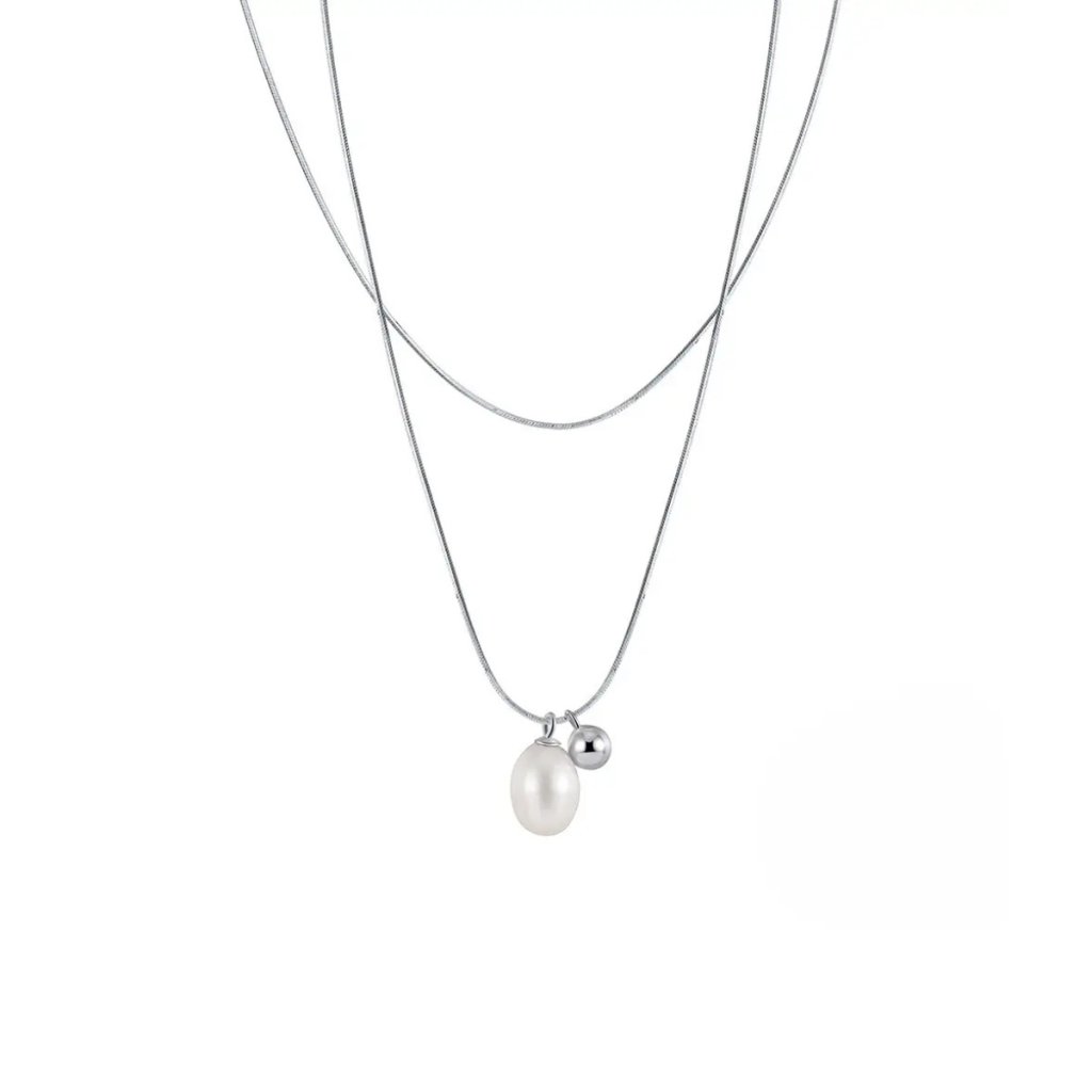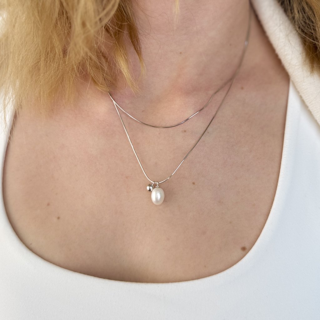 Srebrny łańcuszek LOTA to nowoczesne ujęcie klasycznej biżuterii. Jego podwójny design wykorzystuje popularny styl Snake, przy czym jeden łańcuszek ma długość 45 cm, a drugi jest regulowany w zakresie 40 + 5 cm. Wisiorek zdobi delikatna zawieszka łącząca perłę słodkowodną o długości 9 mm ze srebrnymi kuleczkami.