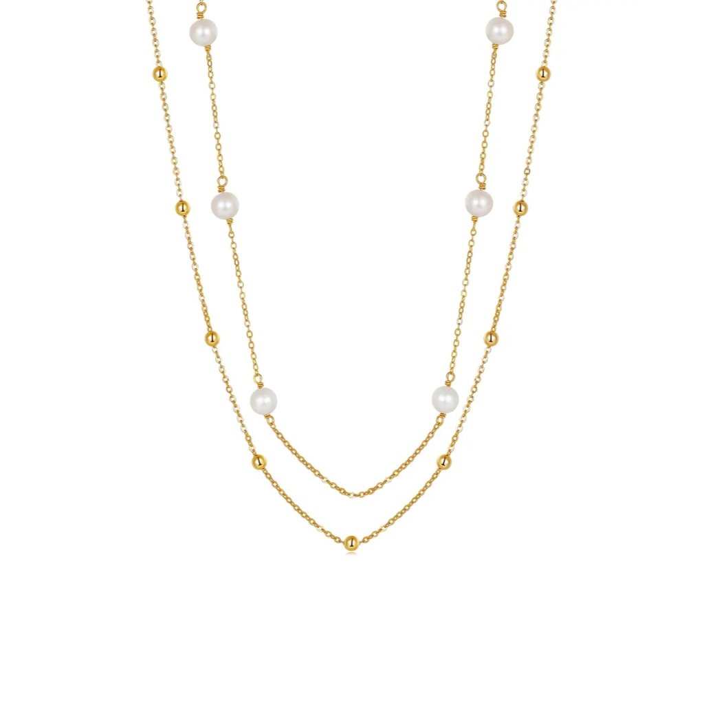 Pozłacany łańcuszek KAJSA to doskonała harmonia dwóch łańcuszków o różnej długości. Dolny łańcuszek typu Link o długości 45 cm ozdobiony jest przepięknymi perłami słodkowodnymi o średnicy 5 mm, natomiast górny łańcuszek typu Beads z regulowaną długością 40 + 5 cm dodaje biżuterii lekkości i zwiewności.