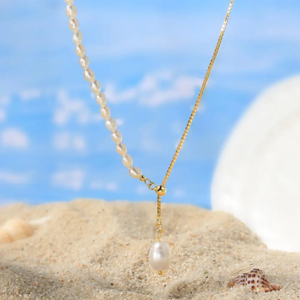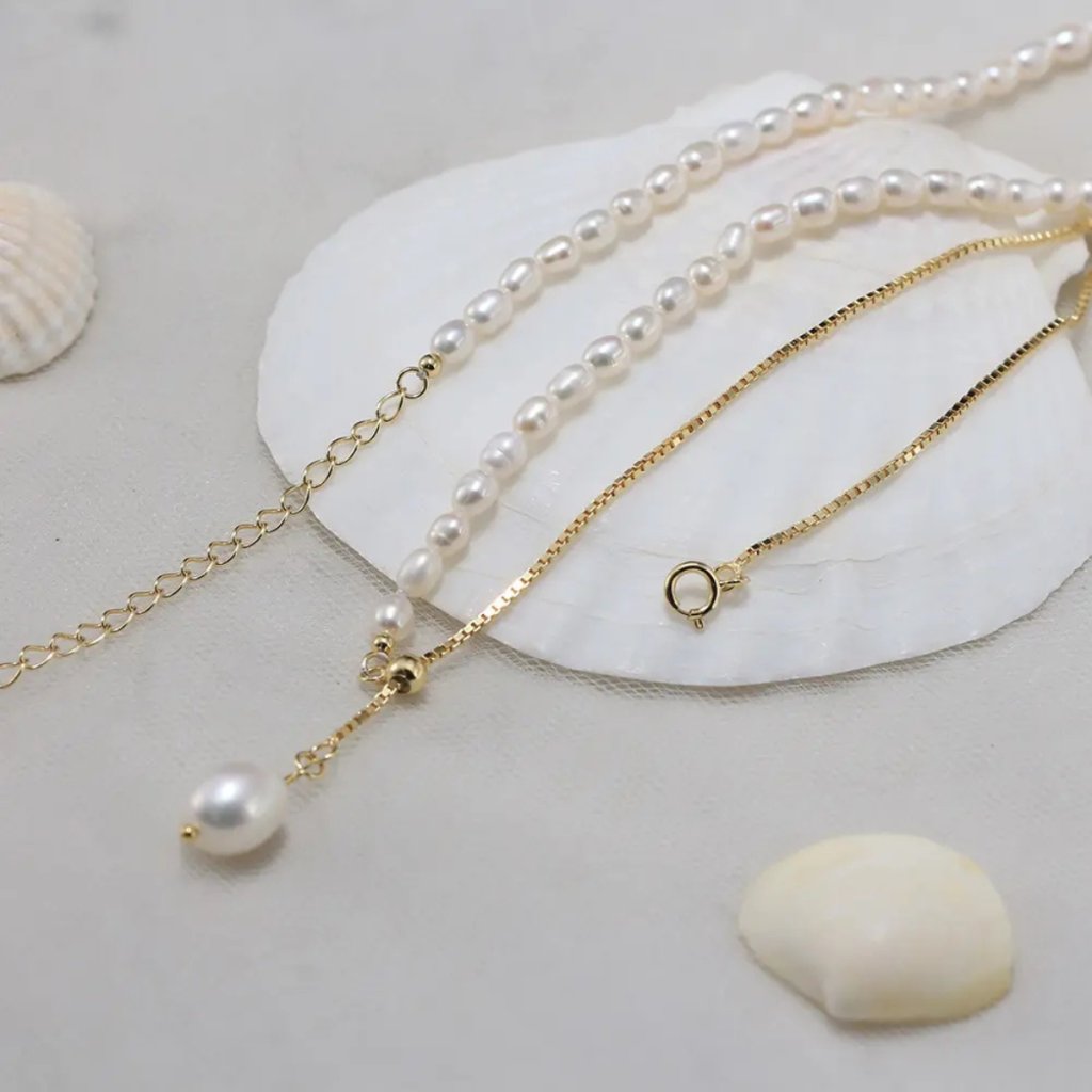 Łańcuszek wykonany jest z wysokiej jakości srebra próby 925/1000 i pokryty luksusowym 14K pozłoceniem, które zapewnia długotrwały, złocisty połysk i podkreśla naturalne piękno pereł. Regulowana długość 45 + 5 cm pozwala dopasować łańcuszek do różnych stylizacji i dekoltów.