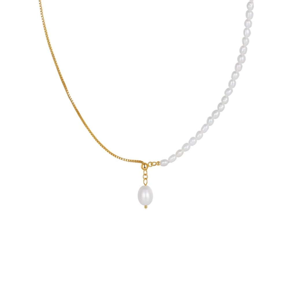 Pozłacany łańcuszek KYLA to wyjątkowe połączenie nowoczesnego designu i klasycznej elegancji. Jego asymetryczna konstrukcja łączy szereg drobnych pereł słodkowodnych (3 mm) z jednej strony z pozłacanym łańcuszkiem typu box z drugiej strony. Całości dopełnia większa perła (7 mm) umieszczona jako centralny wisiorek.
