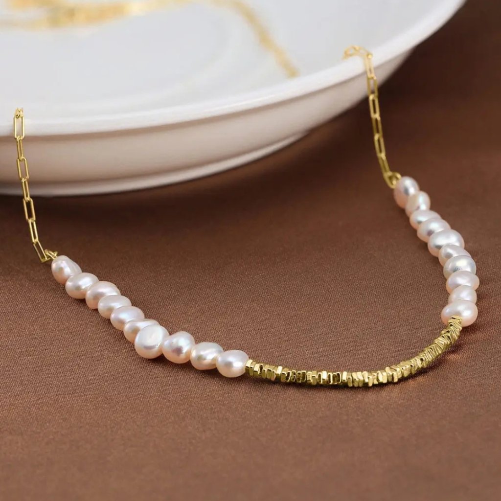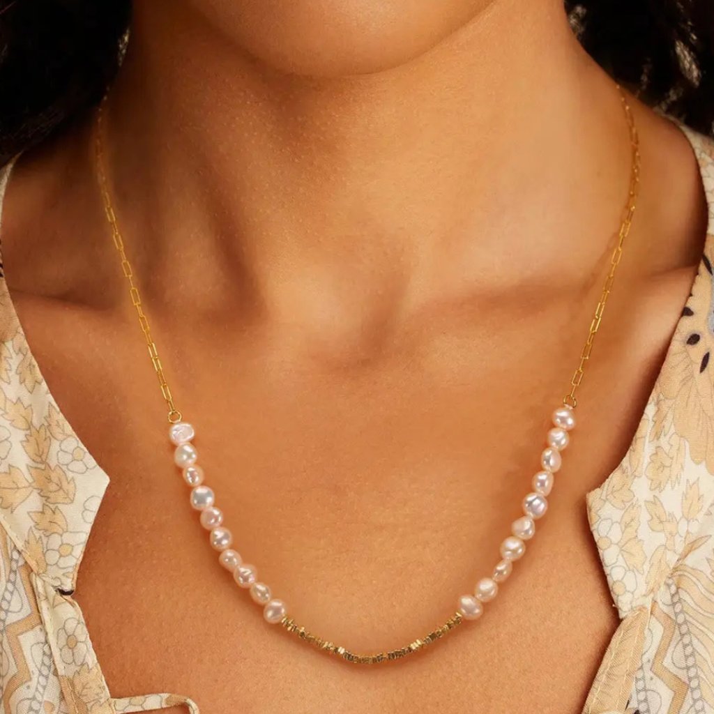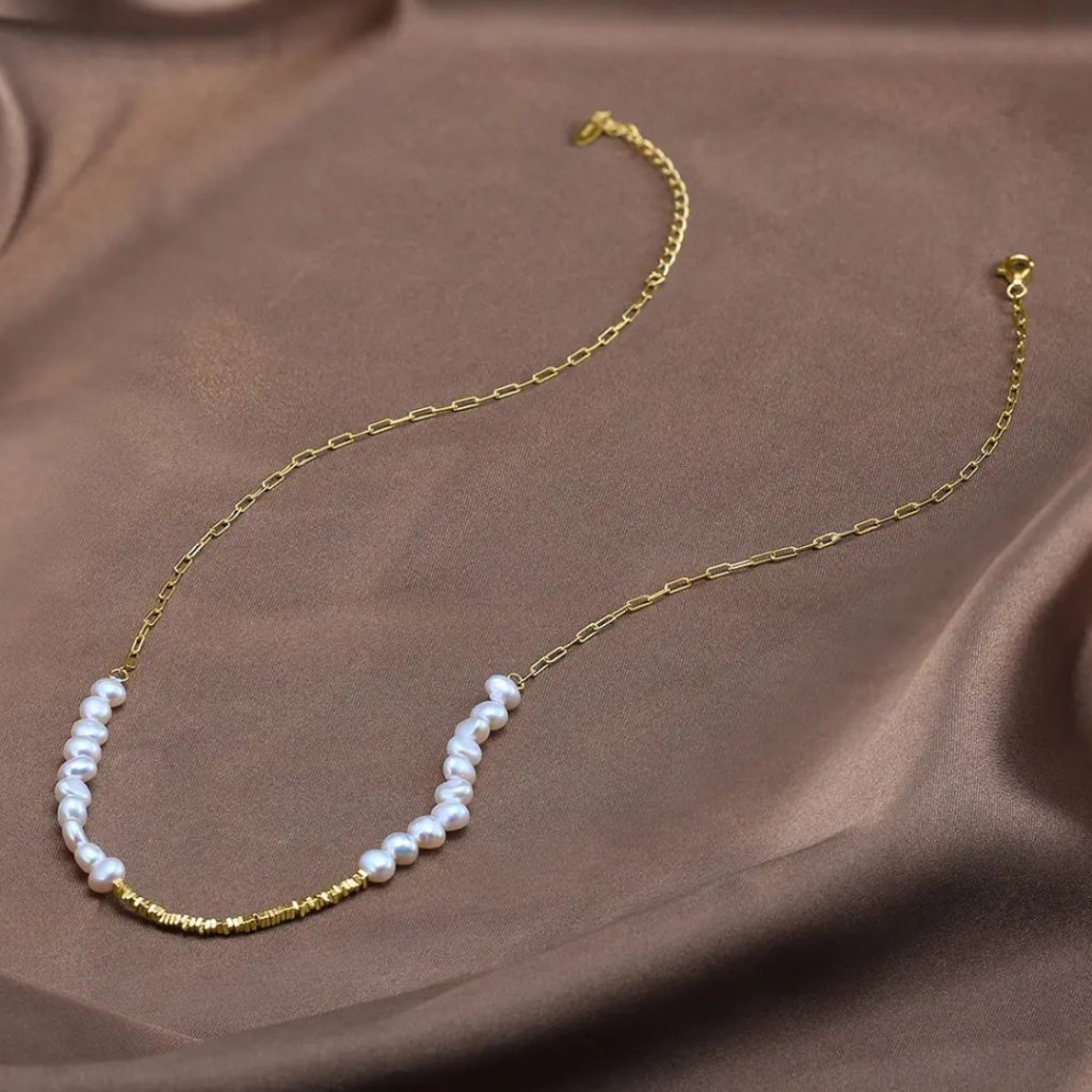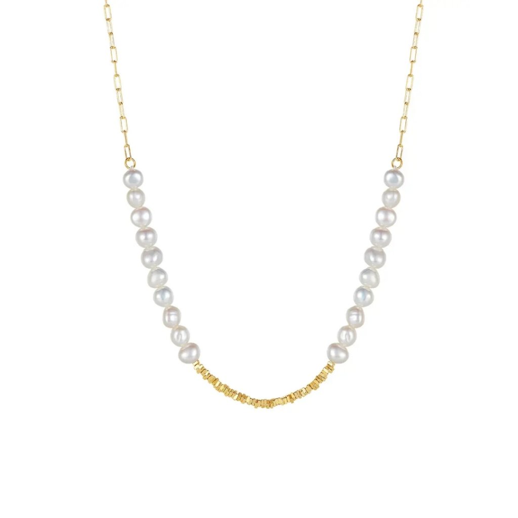 Pozłacany łańcuszek VANESSA to mistrzowskie połączenie nowoczesnego designu i klasycznej elegancji. Jego środkową część tworzą oryginalne pozłacane kosteczki, które z obu stron otoczone są delikatnymi perłami słodkowodnymi o wielkości 4 mm. Resztę łańcuszka tworzy nowoczesny styl Paperclip, który dodaje biżuterii współczesnego charakteru.