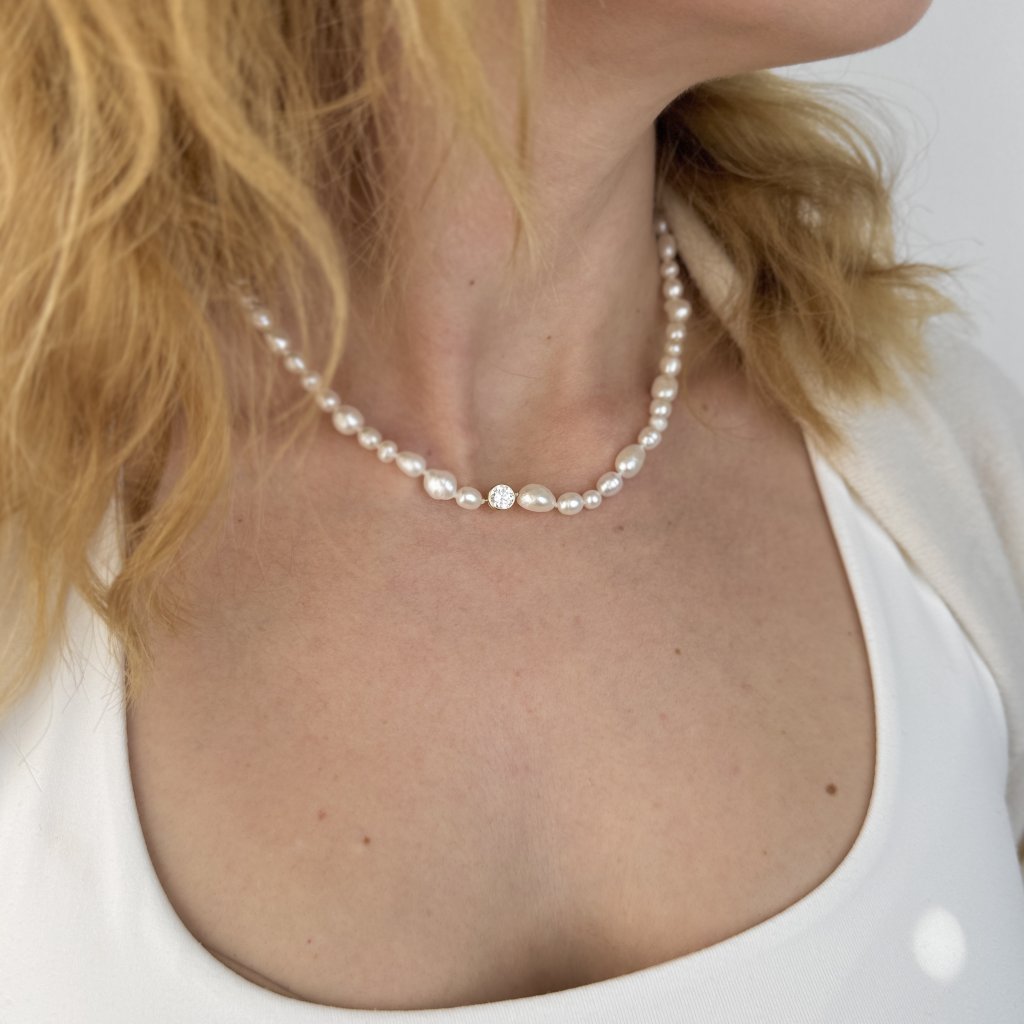 Regulowana długość 40 + 5 cm pozwala dopasować naszyjnik do każdego stroju i okazji. Perły są nawleczone na mocnym łańcuszku typu Pearl, który zapewnia im stabilność i długą żywotność.
