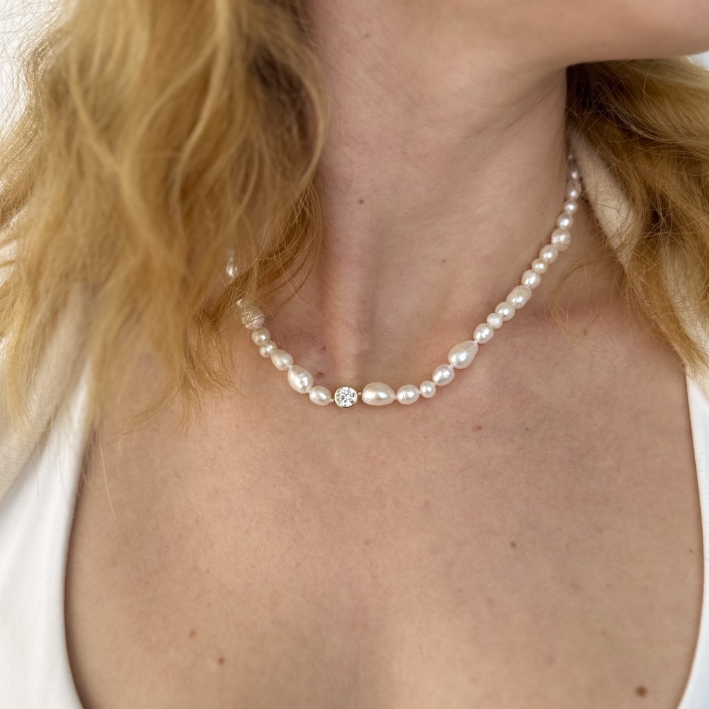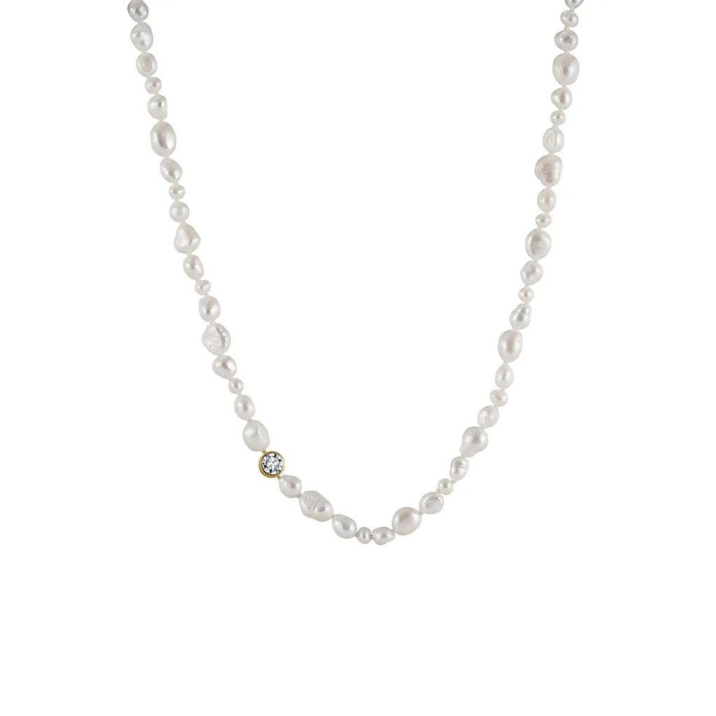 Odkryj piękno pozłacanego naszyjnika z perłami FALLON, który stanowi doskonałą harmonię klasycznego i nowoczesnego designu. Wykonany z wysokiej jakości srebra próby 925/1000 z 14-karatowym złoceniem dla luksusowego wyglądu. Naszyjnik składa się z rzędu przepięknych pereł słodkowodnych o szerokości 5-7 mm, których naturalne piękno podkreślone jest błyszczącym cyrkoniem o średnicy 6 mm.
