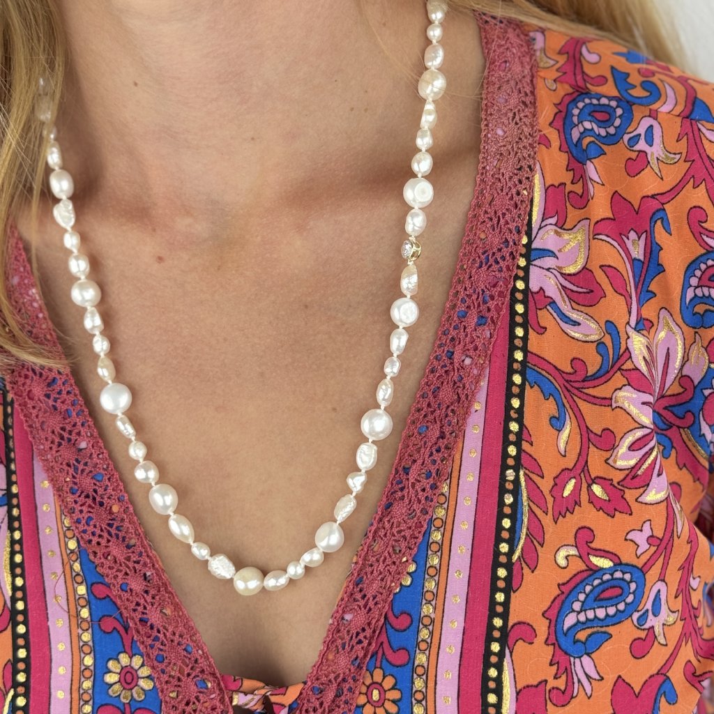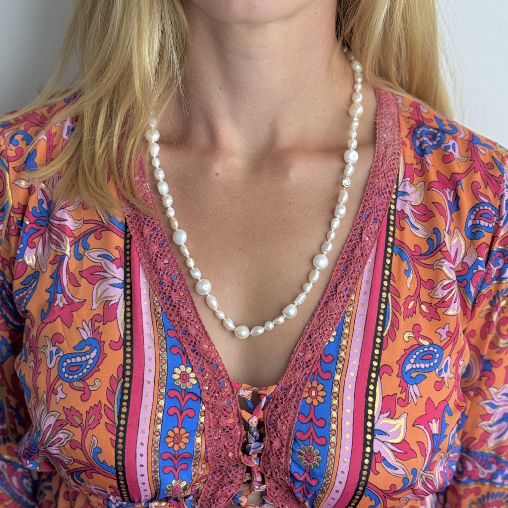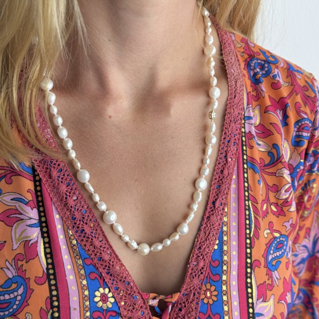 Przedłużona długość 60 + 5 cm umożliwia noszenie naszyjnika na różne sposoby i dopasowanie go do każdej stylizacji. Perły są bezpiecznie przymocowane do łańcuszka typu Pearl, co zapewnia ich stabilność i trwałość.
