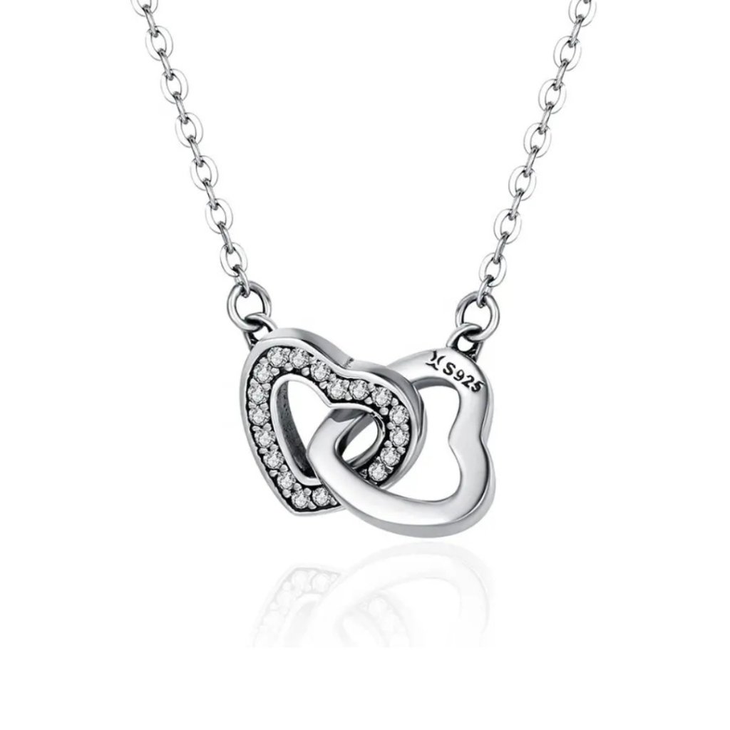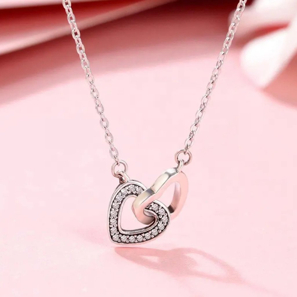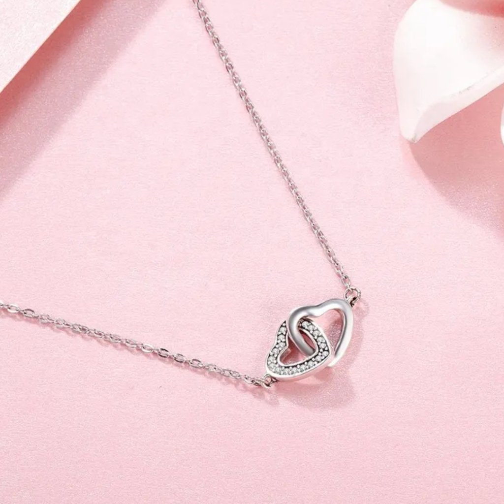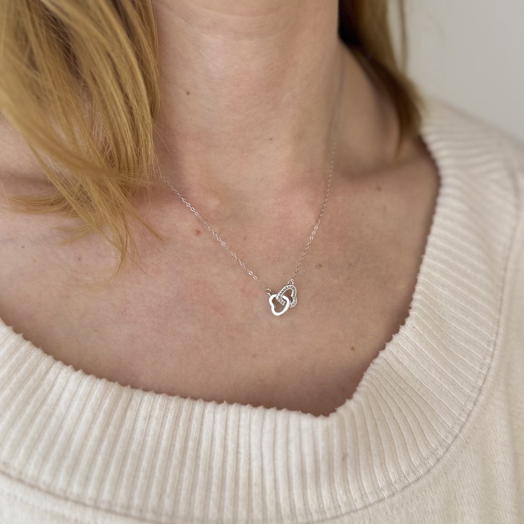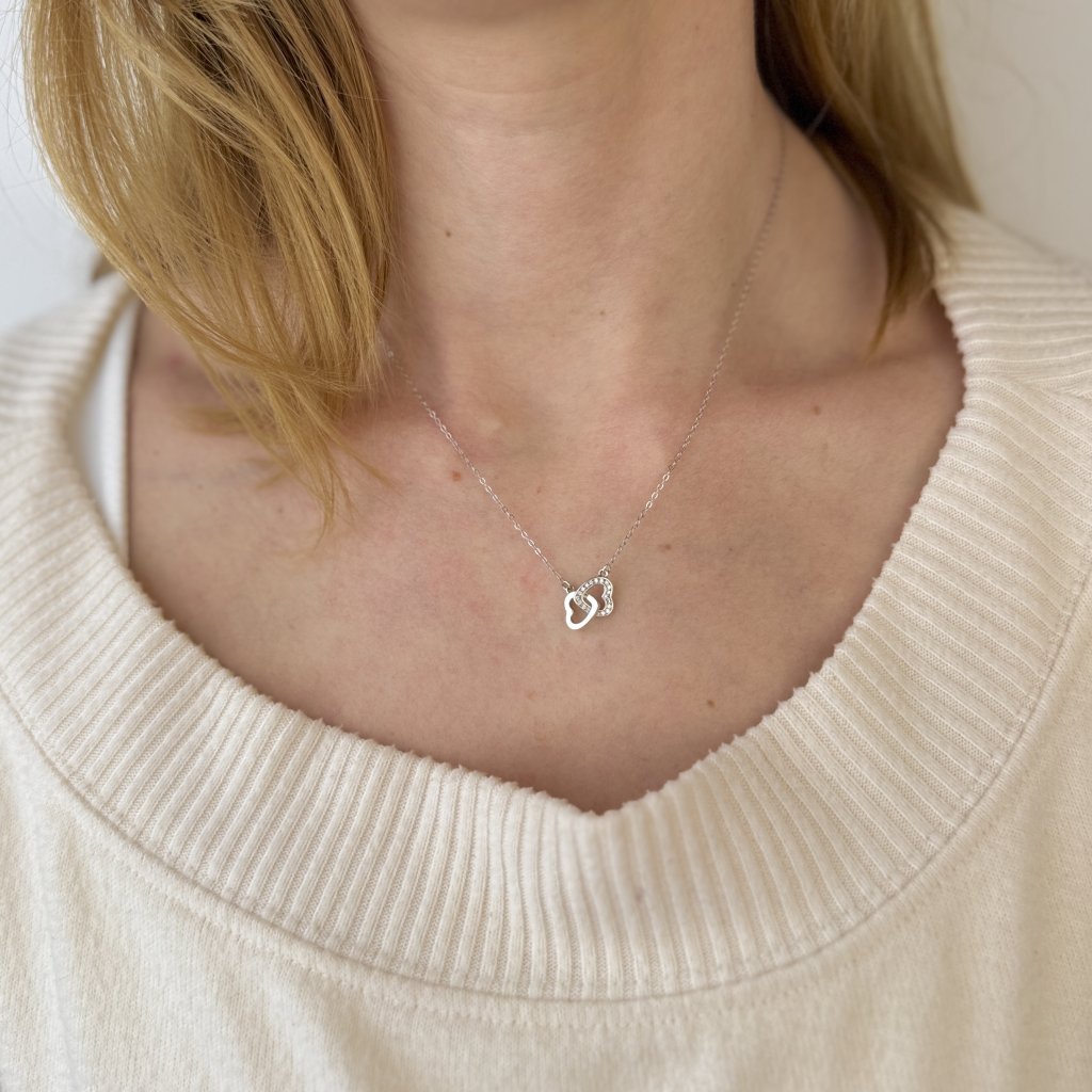 Wisiorek o wymiarach 10 × 15 mm przedstawia dwa wzajemnie splecione serca, z których jedno jest ozdobione błyszczącymi cyrkoniami, a drugie wyróżnia się czystą formą. Łańcuszek z regulowaną długością 38 + 8 cm możesz nosić jako choker lub klasyczny naszyjnik.